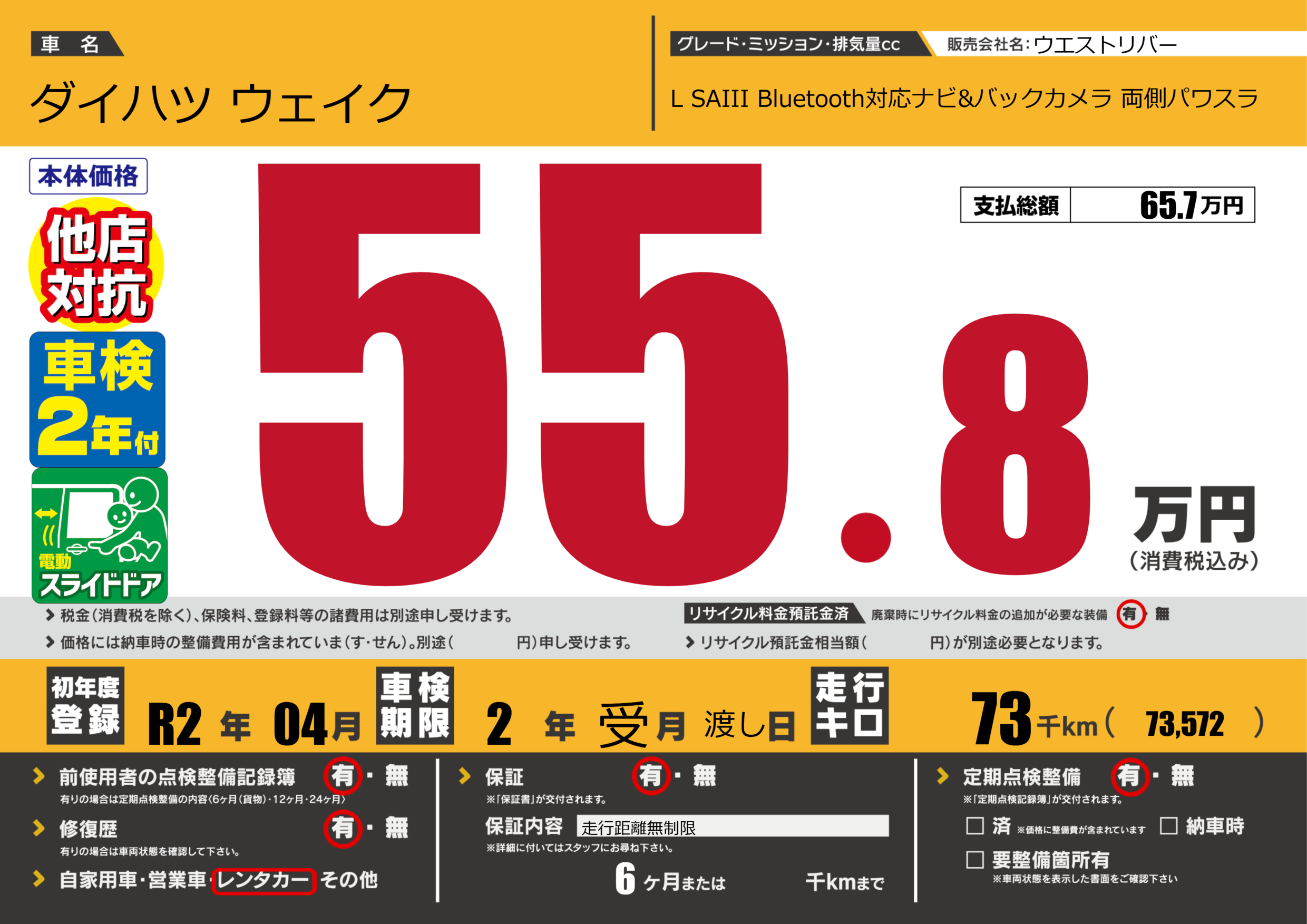 | 車名 | ダイハツ ウェイク | グレード ミッション 排気量 |