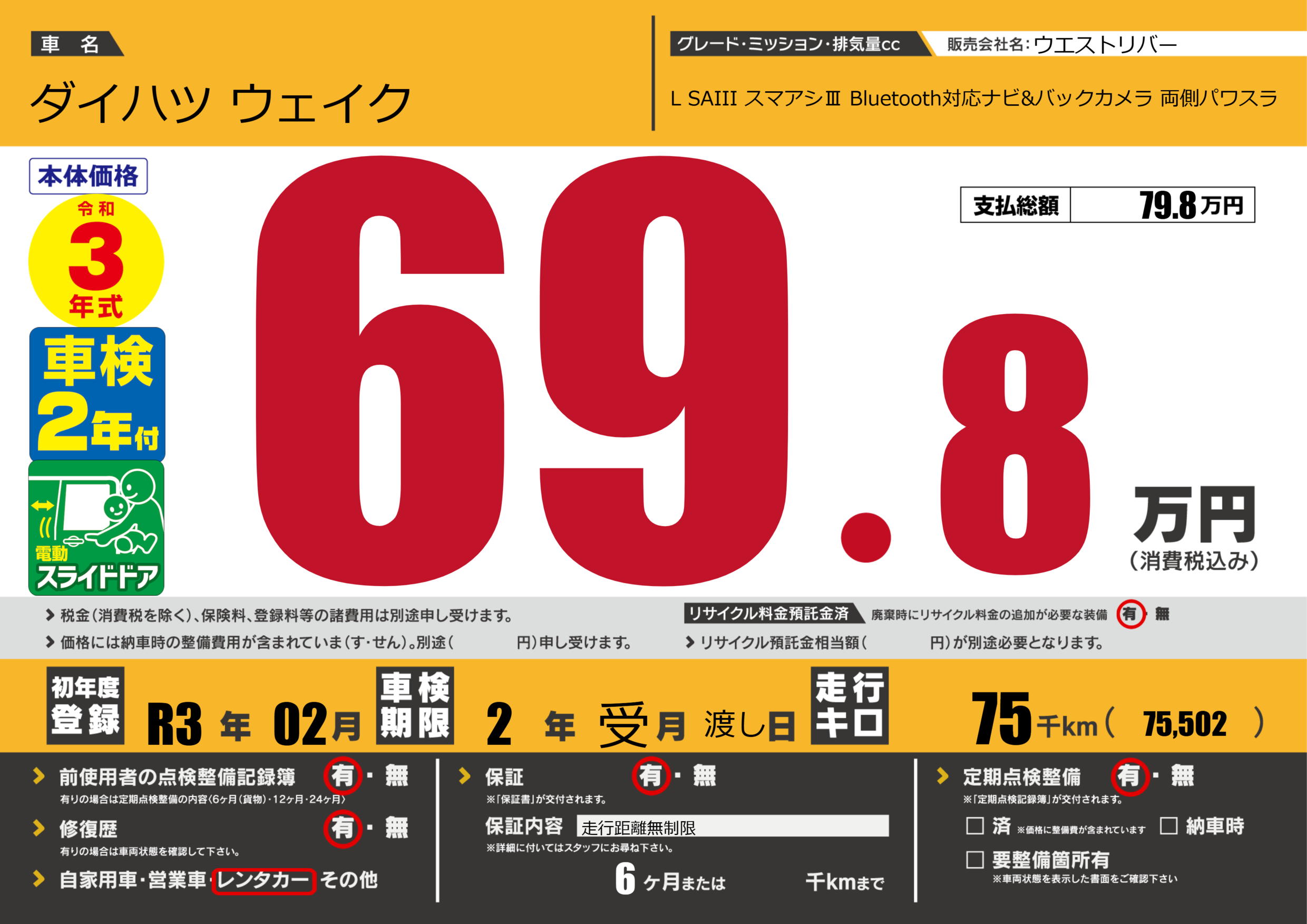 | 車名 | ダイハツ ウェイク | グレード ミッション 排気量 |
