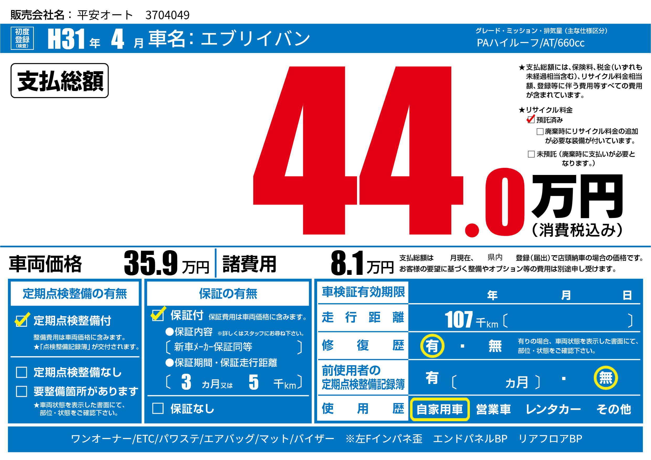 | 車名 | エブリイバン | グレード ミッション 排気量 |