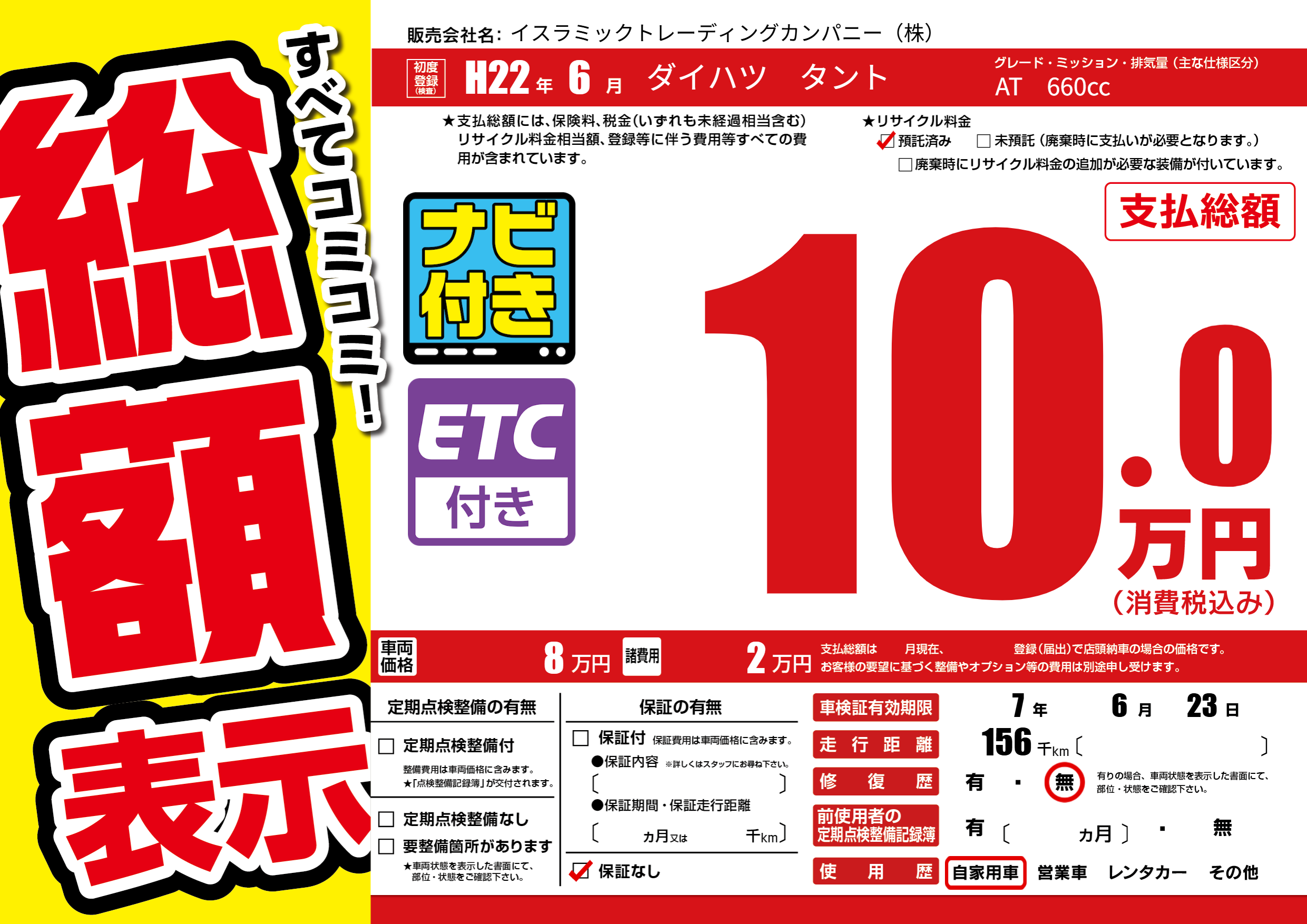 | 車名 | ダイハツ タント | グレード ミッション 排気量 |