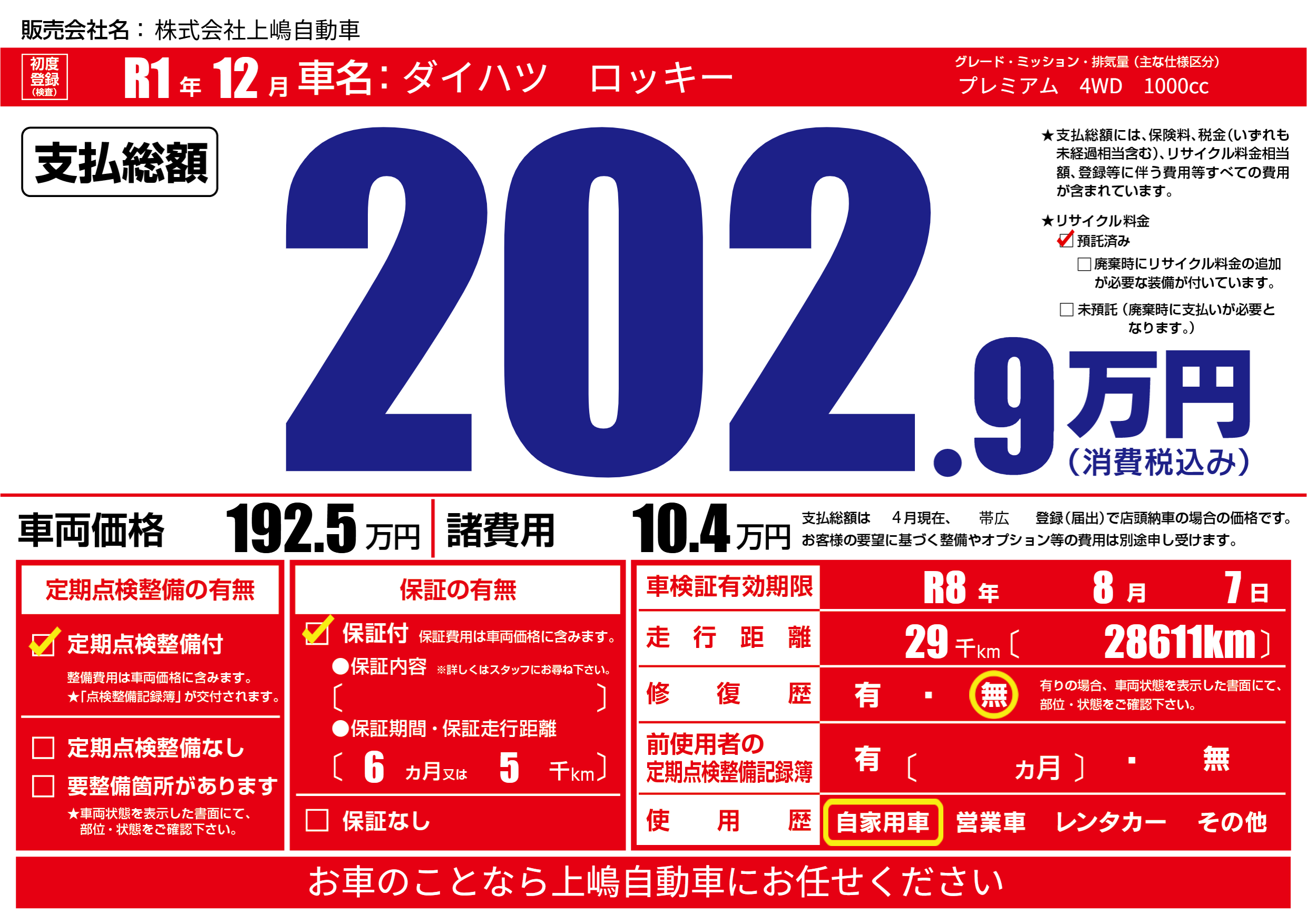 | 車名 | ダイハツ ロッキー | グレード ミッション 排気量 |