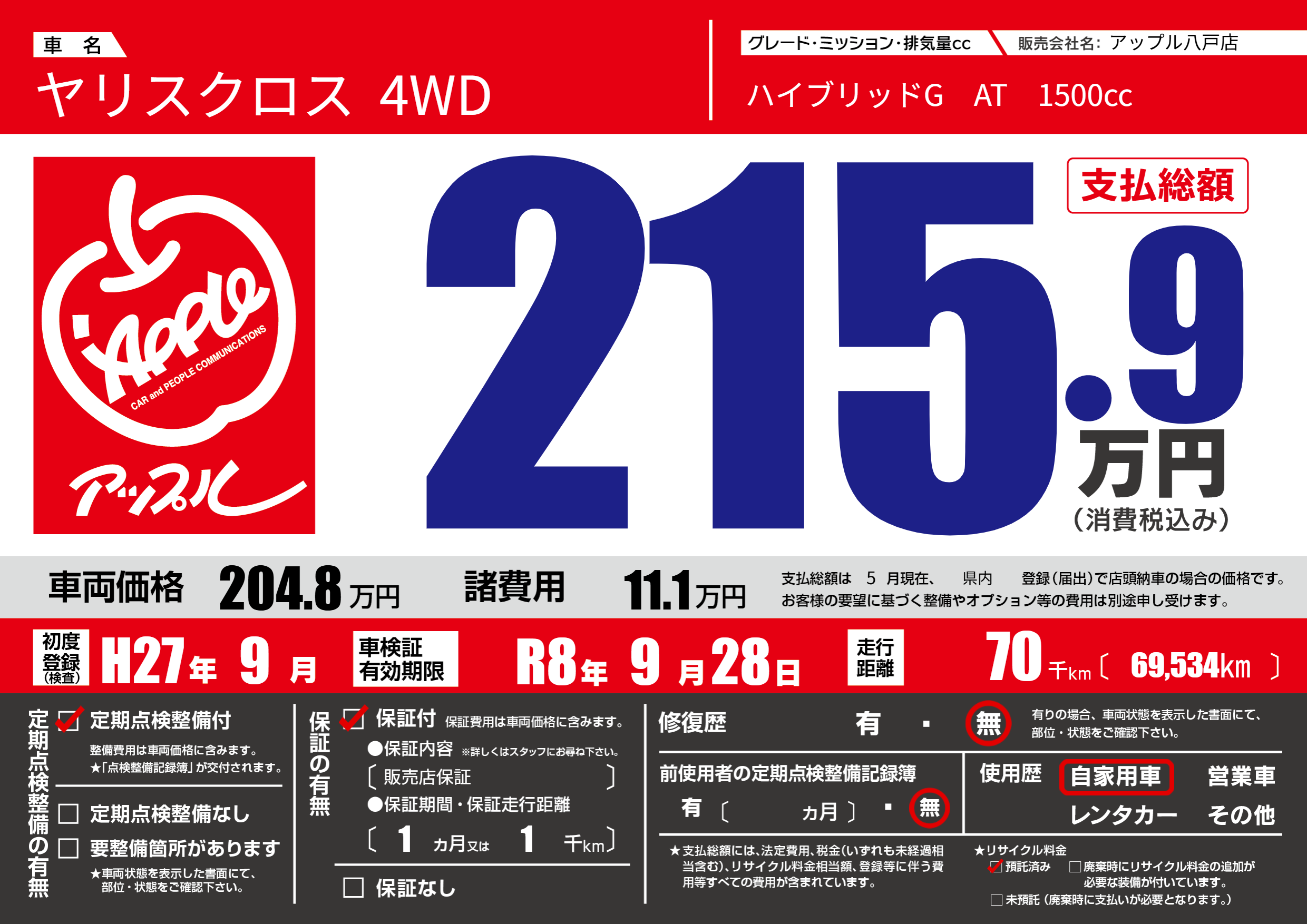 | 車名 | ヤリスクロス 4WD | グレード ミッション 排気量 |