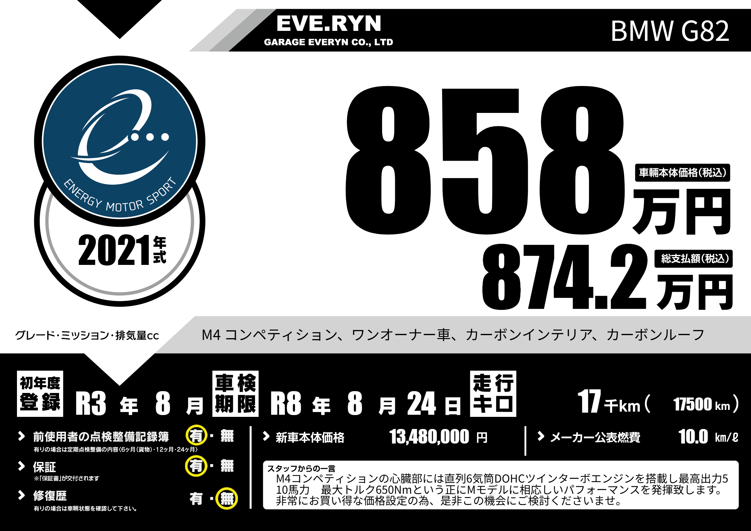 | 車名 | BMW G82 | グレード ミッション 排気量 |