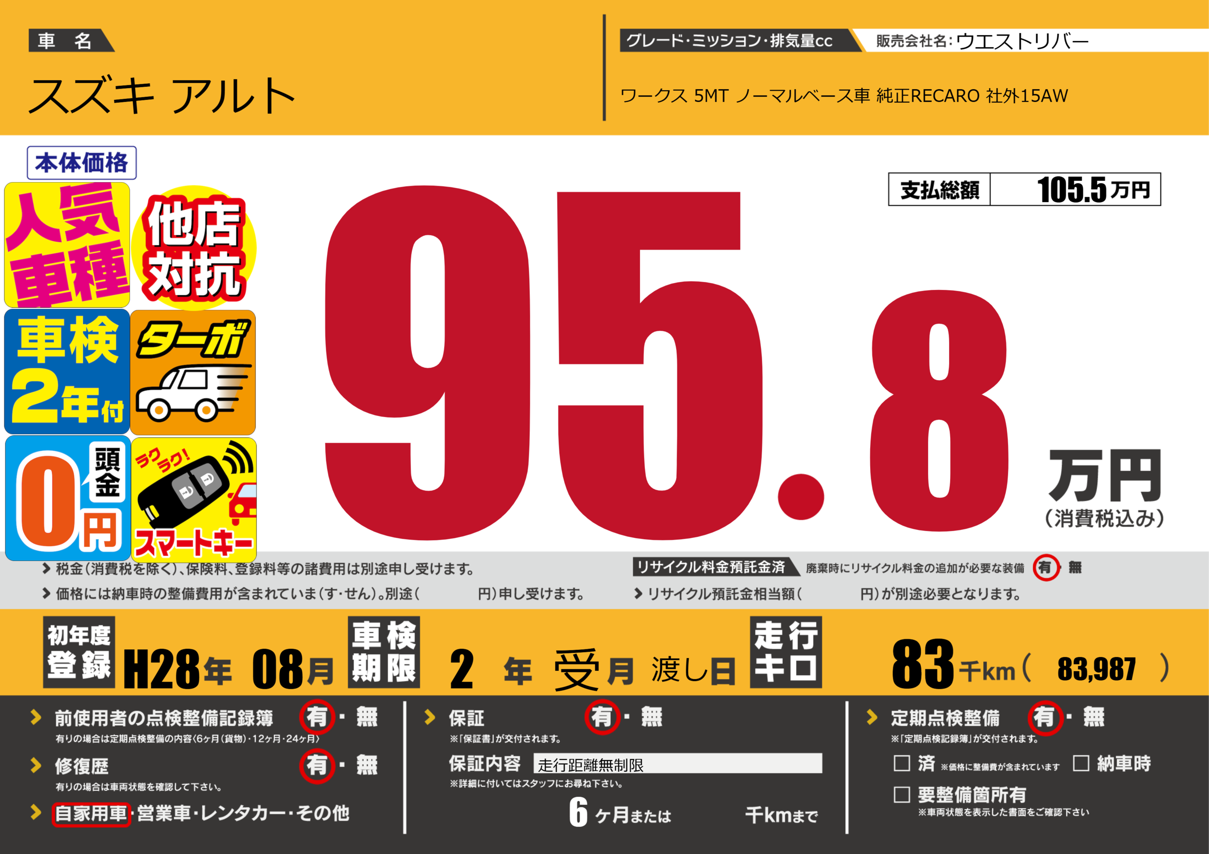| 車名 | スズキ アルト | グレード ミッション 排気量 |
