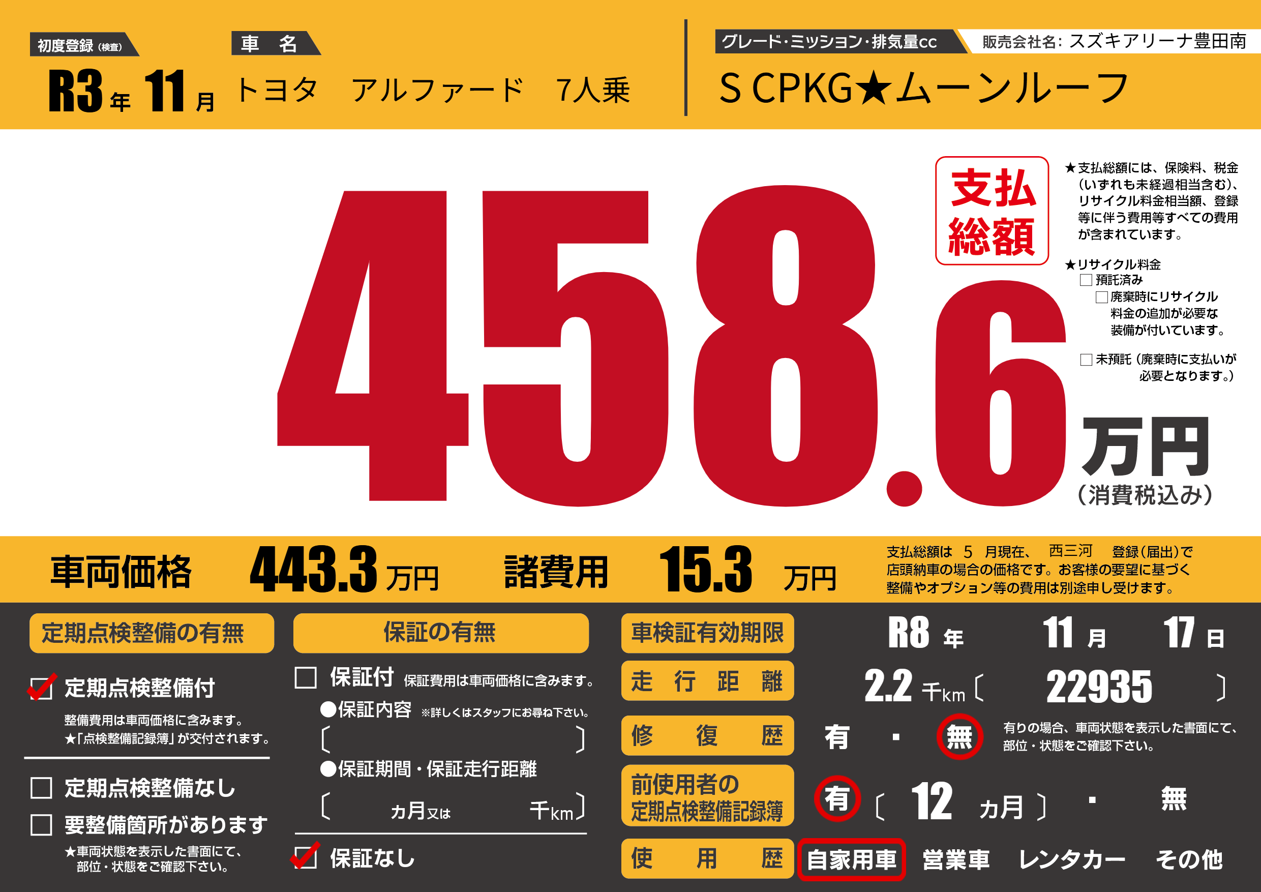 | 車名 | トヨタ アルファード 7人乗 | グレード ミッション 排気量 |