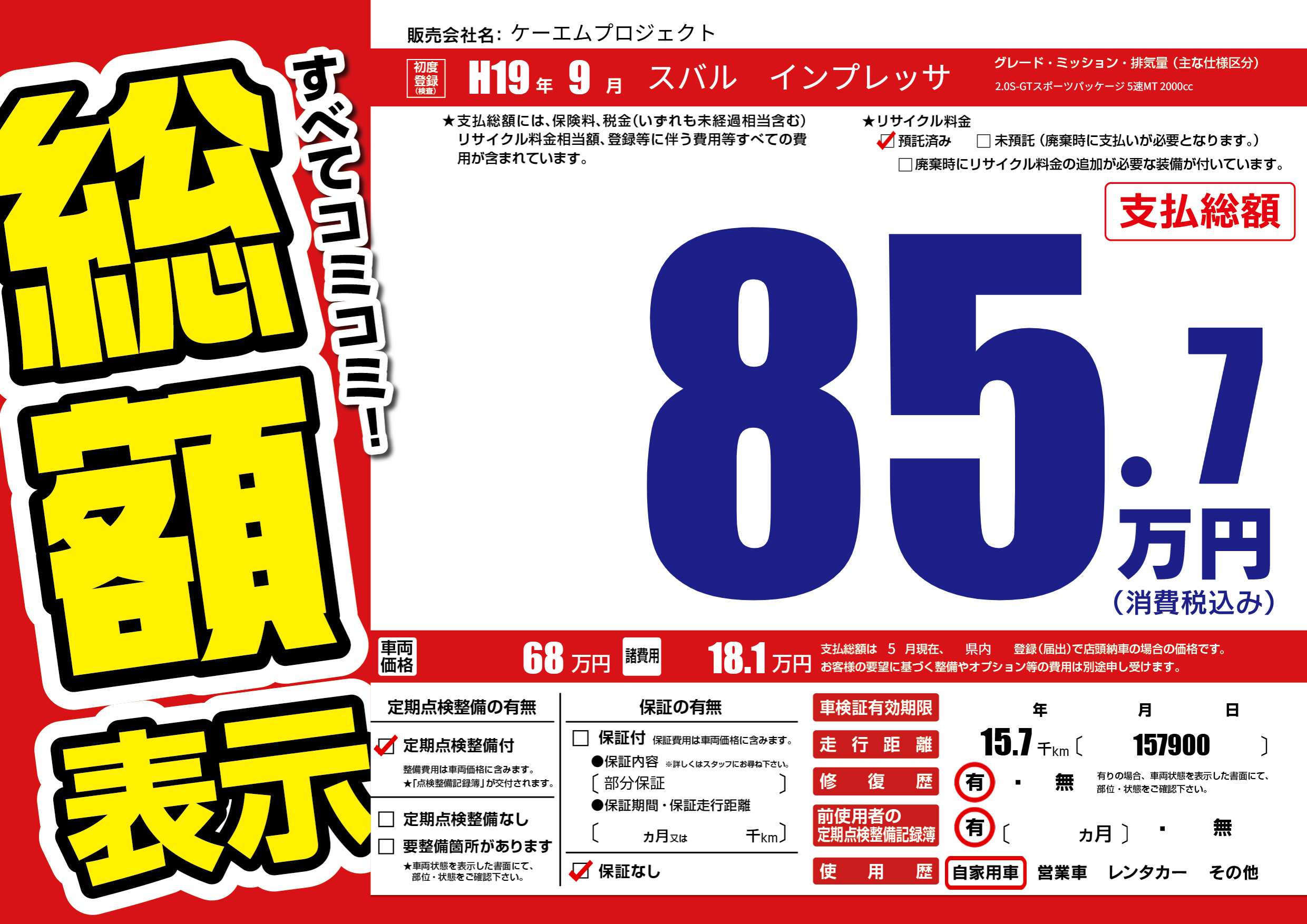 | 車検制限 | - 年 - 月 - 日 | ||