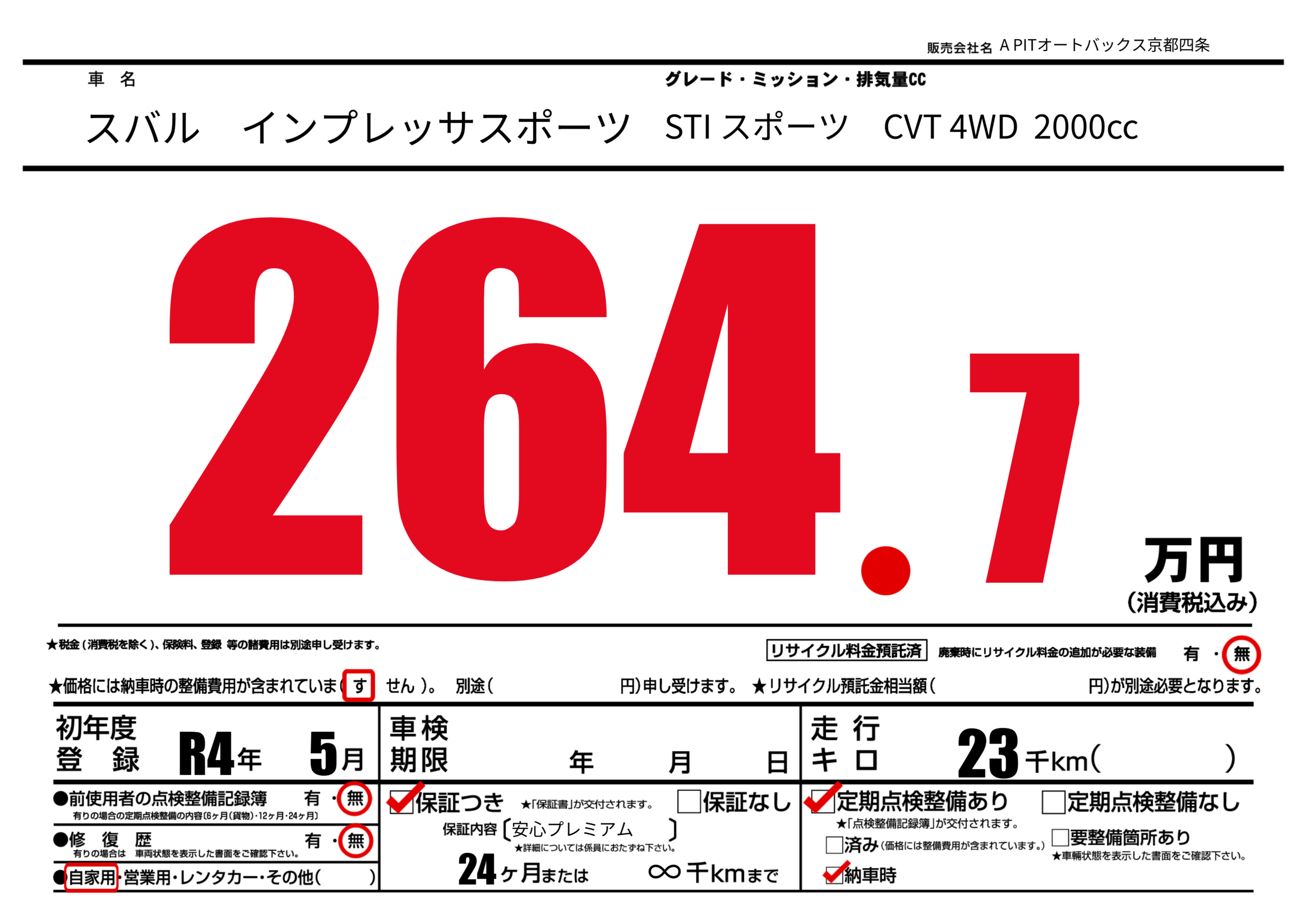 保証なし 保証内容(安心プレミアム) 24ヶ月または(∞)千kmまで |