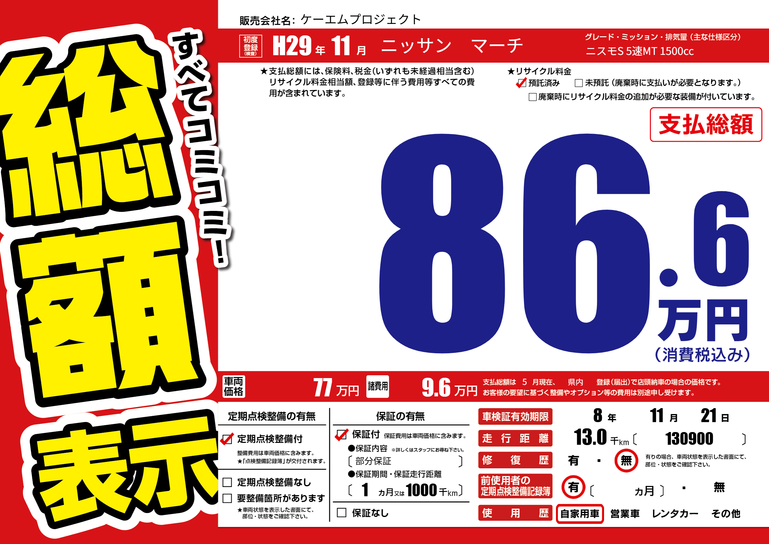 | 車名 | ニッサン マーチ | グレード ミッション 排気量 |