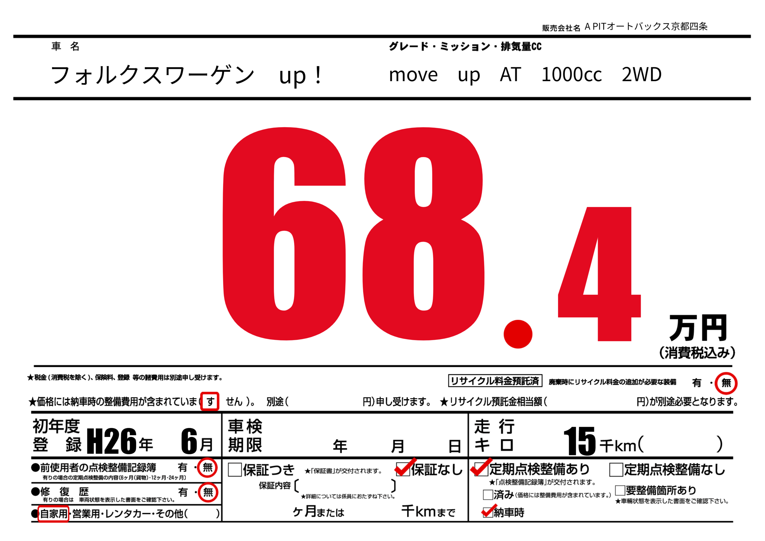 | 車名 | フォルクスワーゲン up! | グレード ミッション 排気量 |
