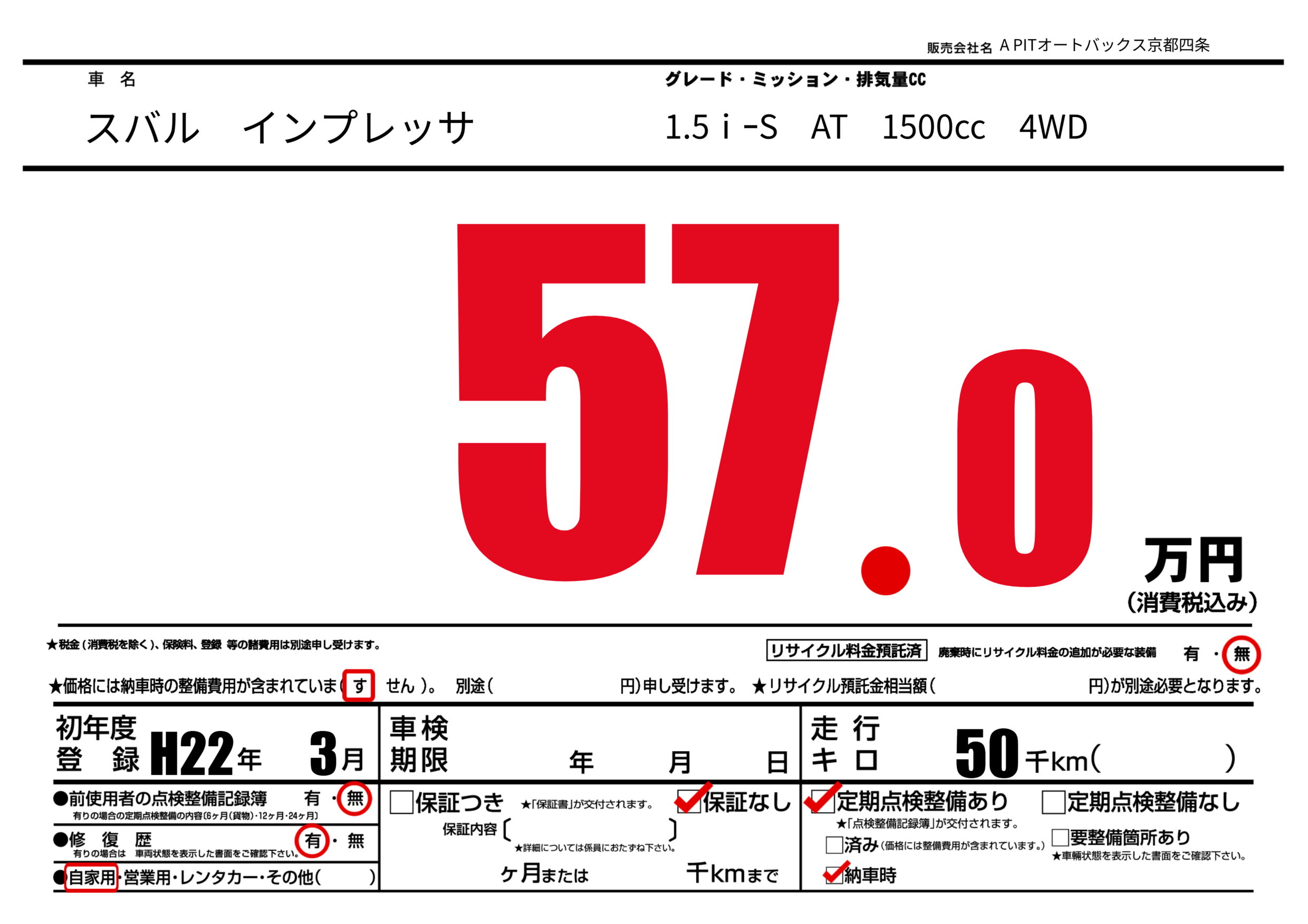 | 走行キロ | 5万km | 初年度登録 | H22年3月 |