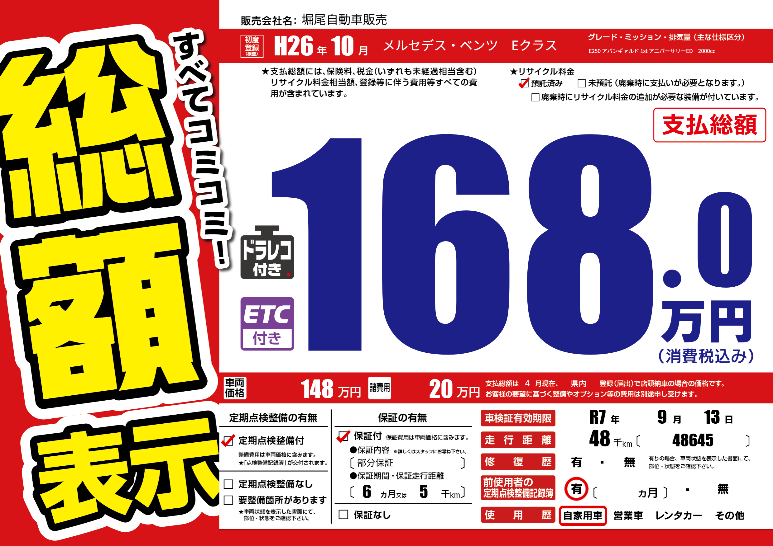 | 車名 | メルセデス・ベンツ Eクラス | グレード ミッション 排気量 |