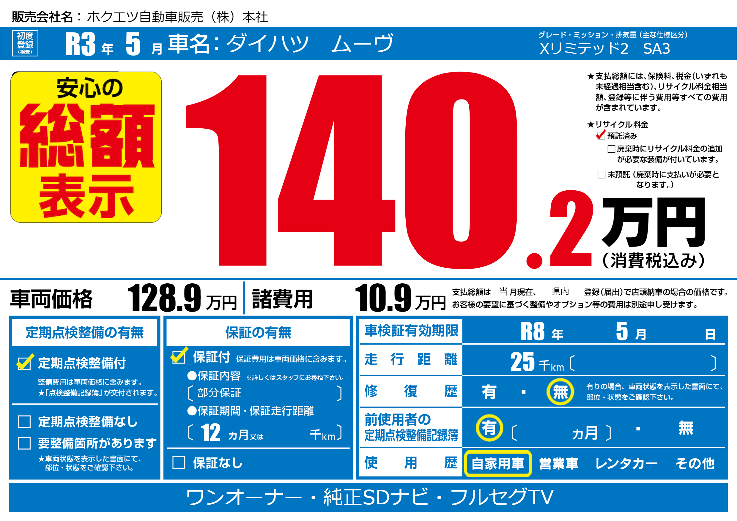 | 走行キロ | 2.5万km | 初年度登録 | R3年5月 |