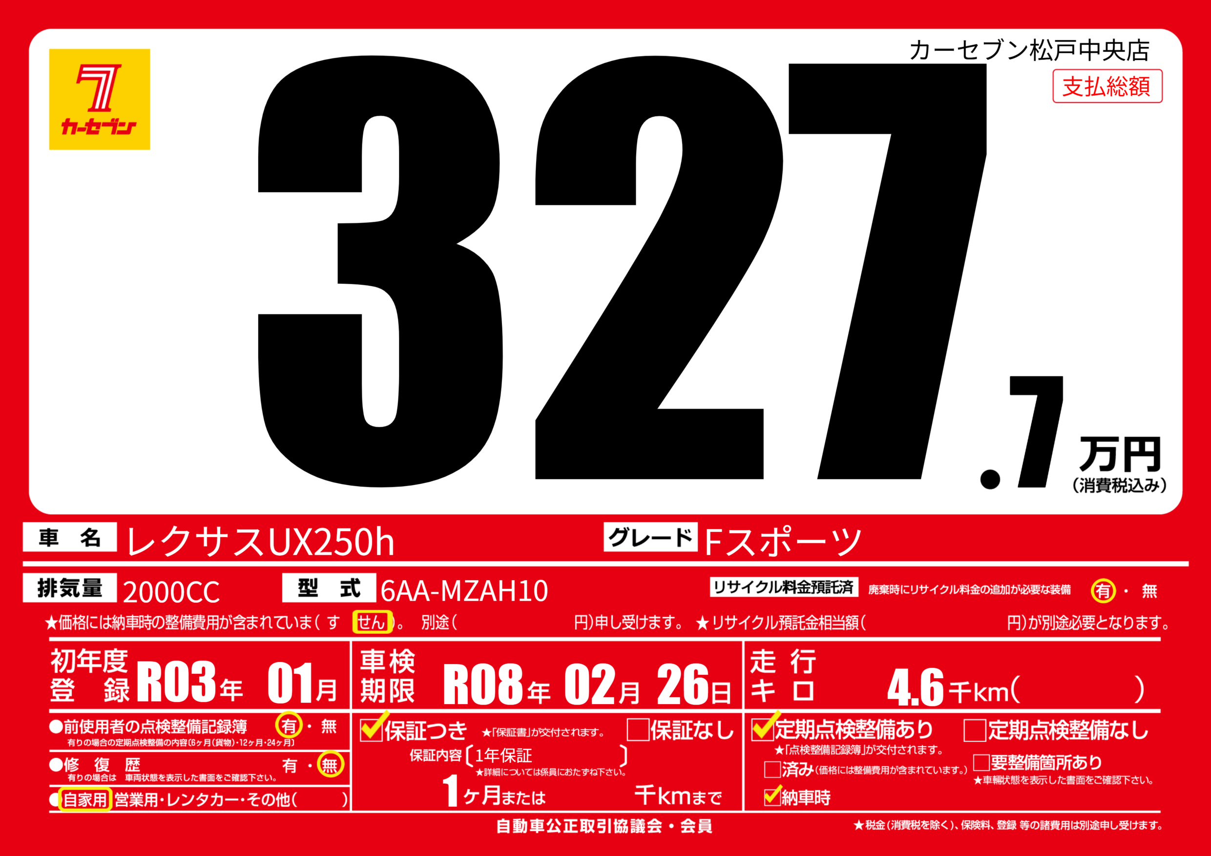 | 車名 | レクサスUX250h | グレード ミッション 排気量 |