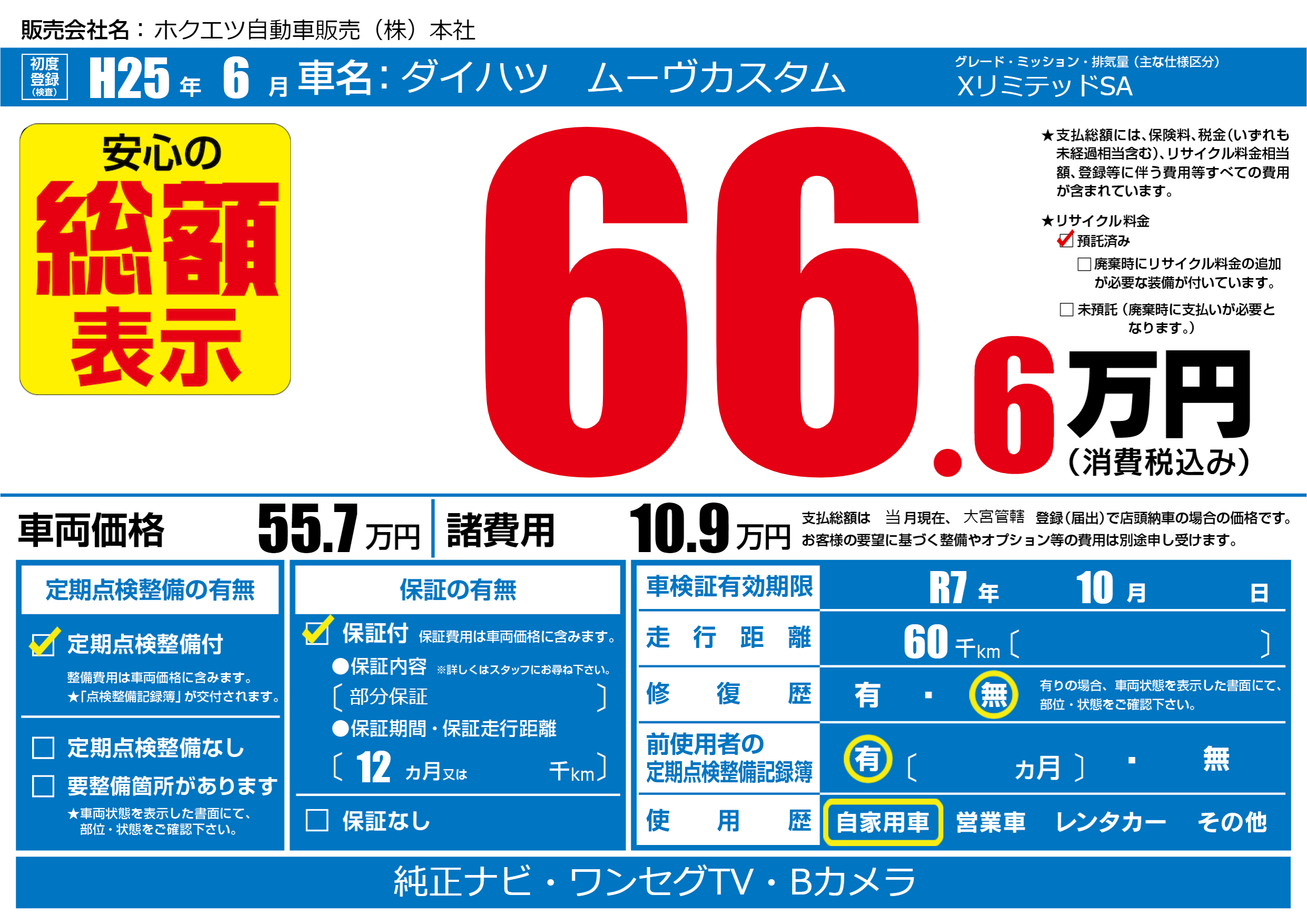 | 走行キロ | 6万km | 初年度登録 | H25年6月 |