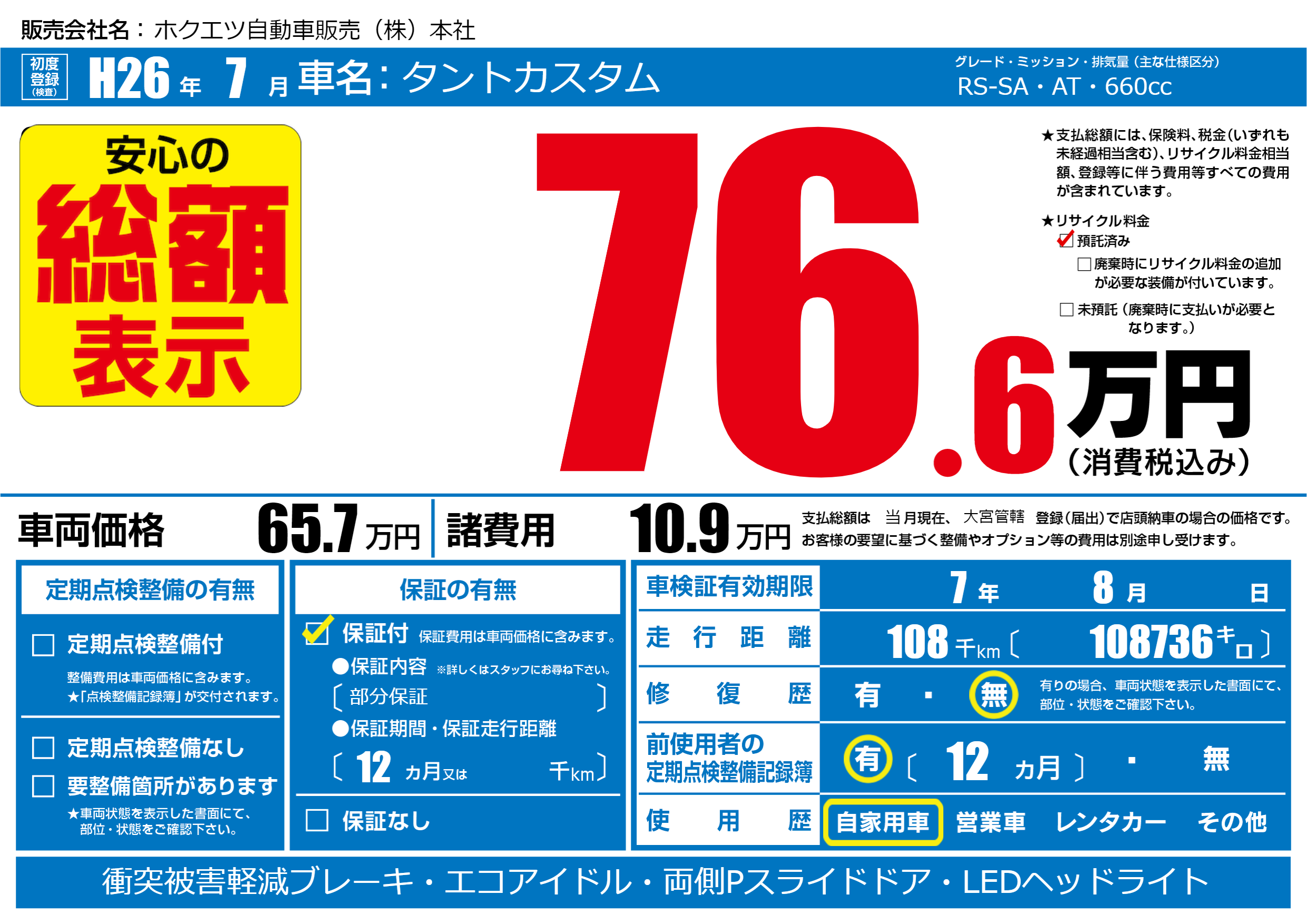 | 走行キロ | 10.8万km | 初年度登録 | H26年7月 |