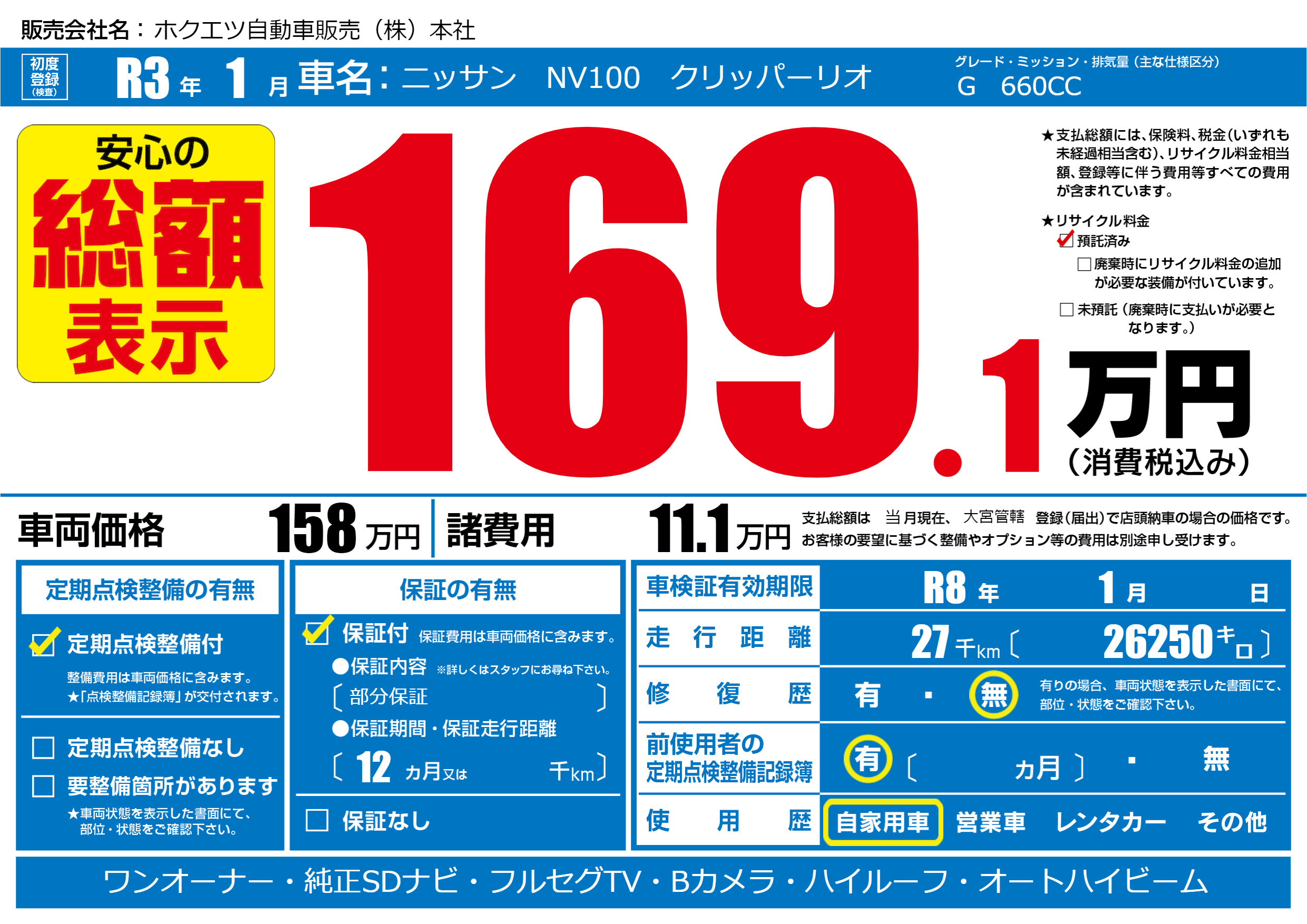 | 車名 | ニッサン NV100 クリッパーリオ | グレード ミッション 排気量 |