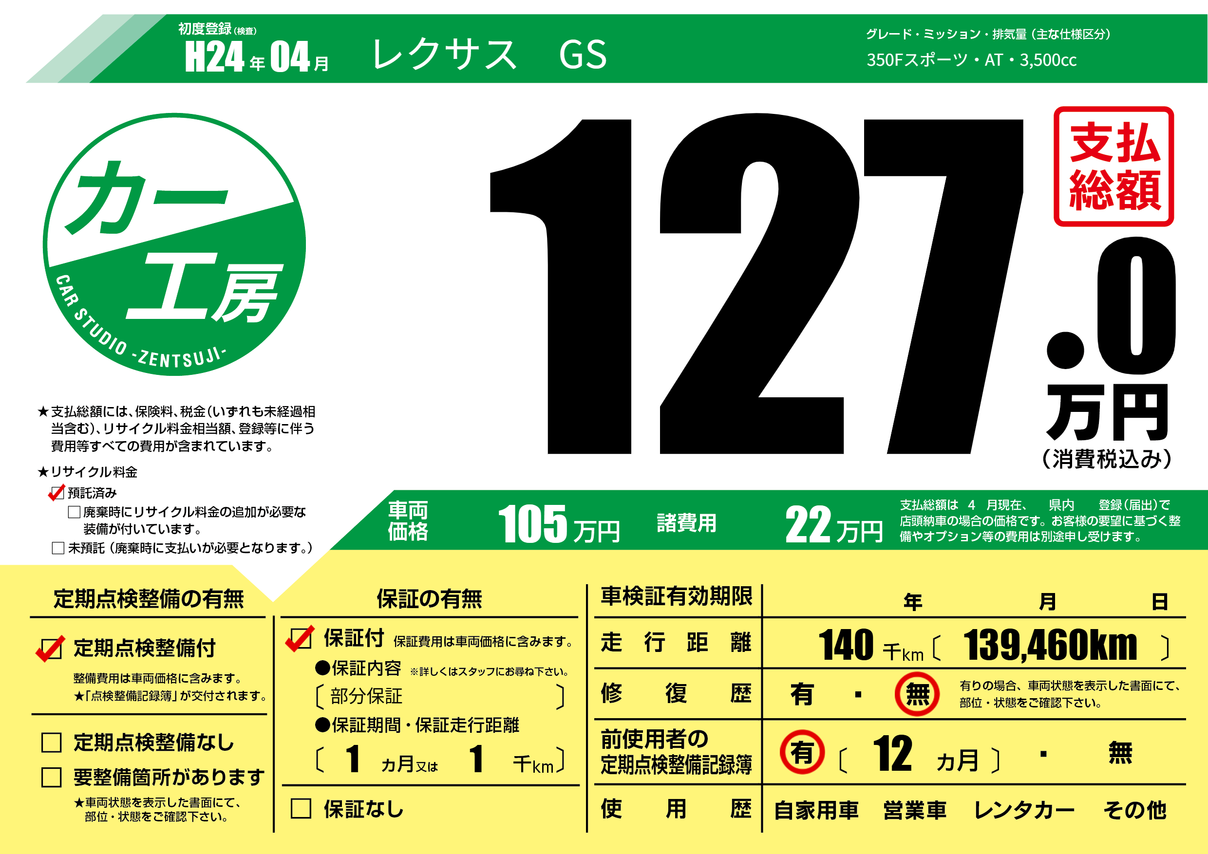 | 車名 | レクサス GS | グレード ミッション 排気量 |