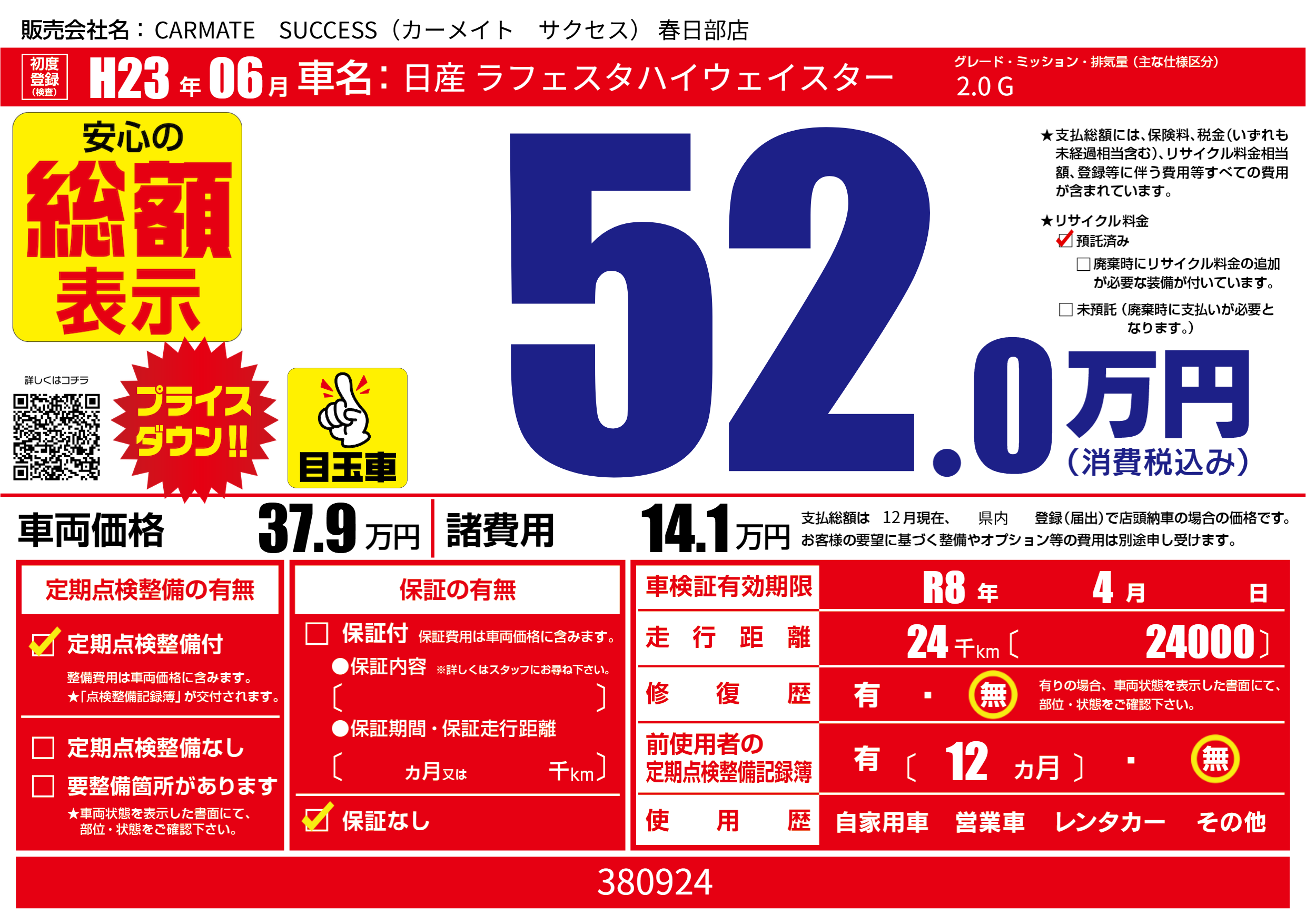 | 車検制限 | R8年 4月 - 日 | ||