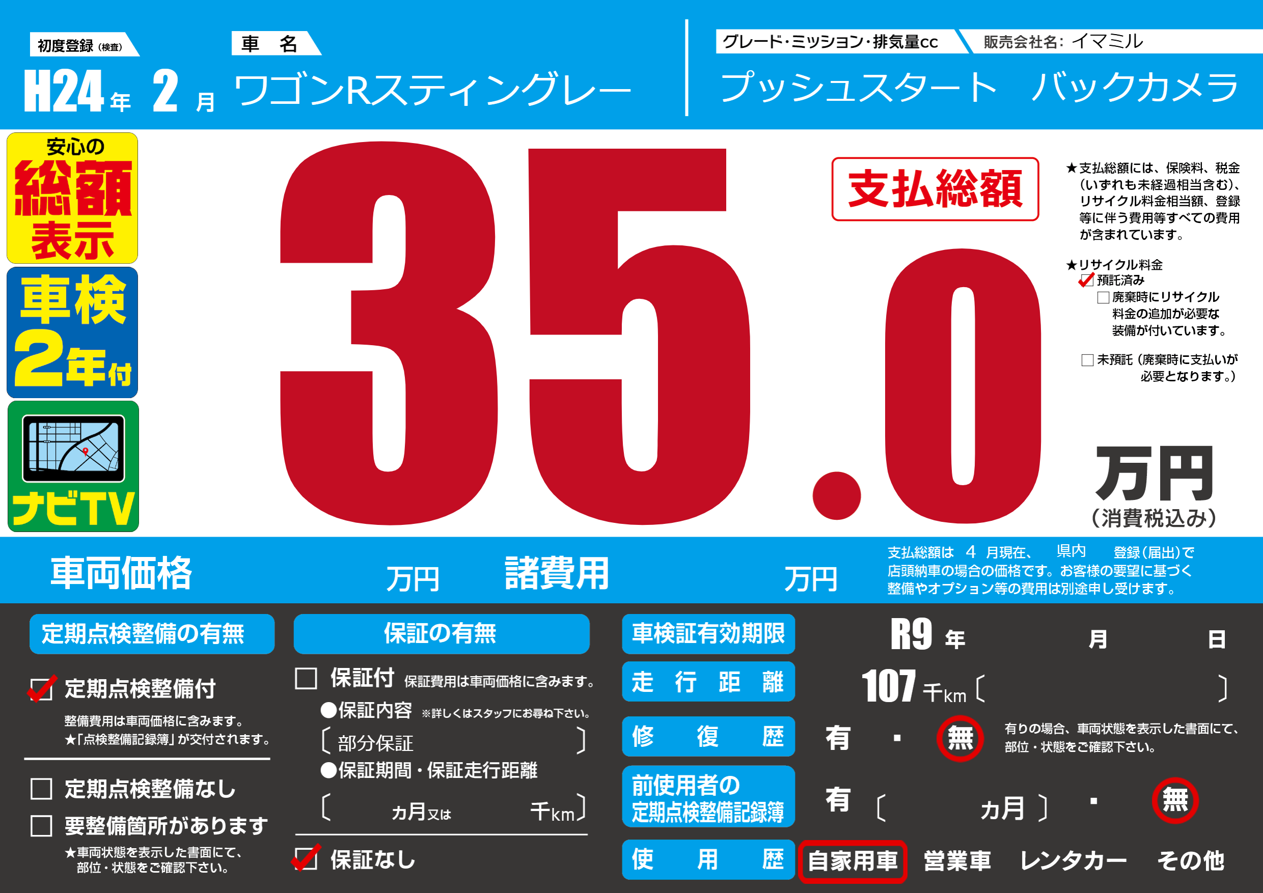 | 車検制限 | R9年 - 月 - 日 | ||