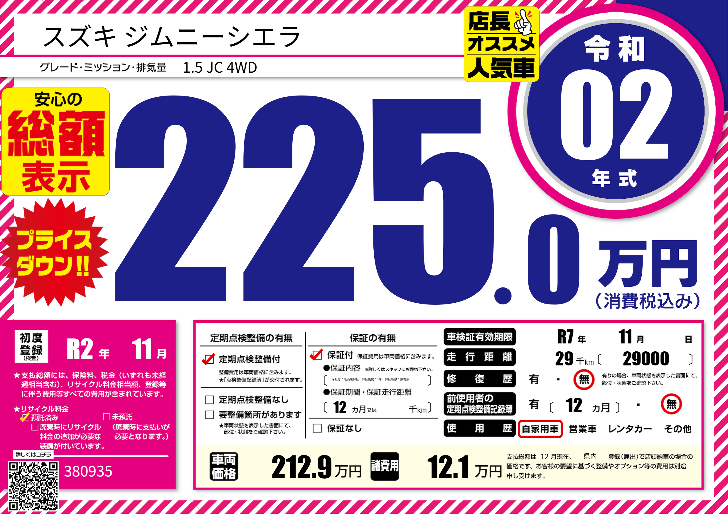 | 車名 | スズキ ジムニーシエラ | グレード ミッション 排気量 |