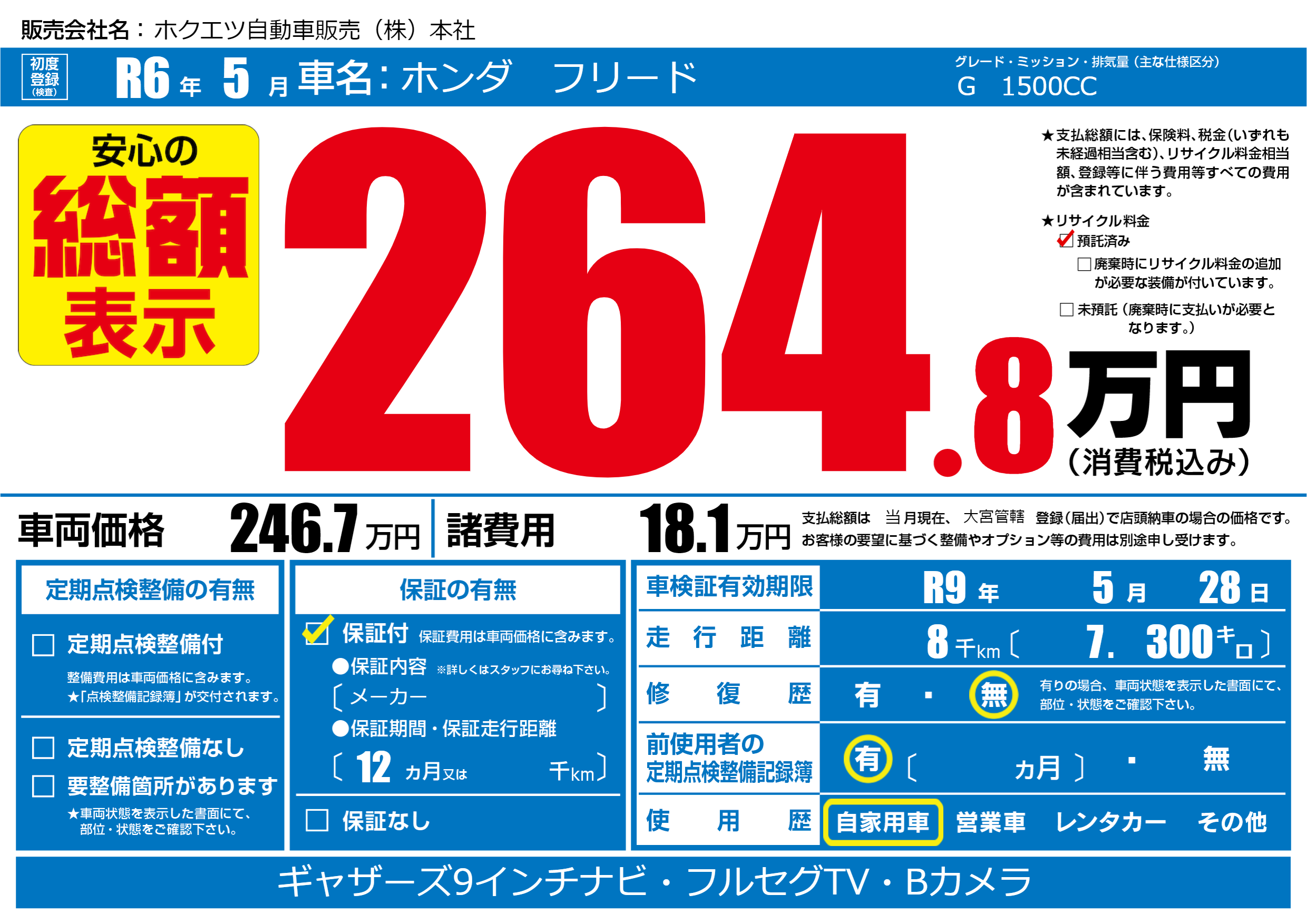 | 車名 | ホンダ フリード | グレード ミッション 排気量 |