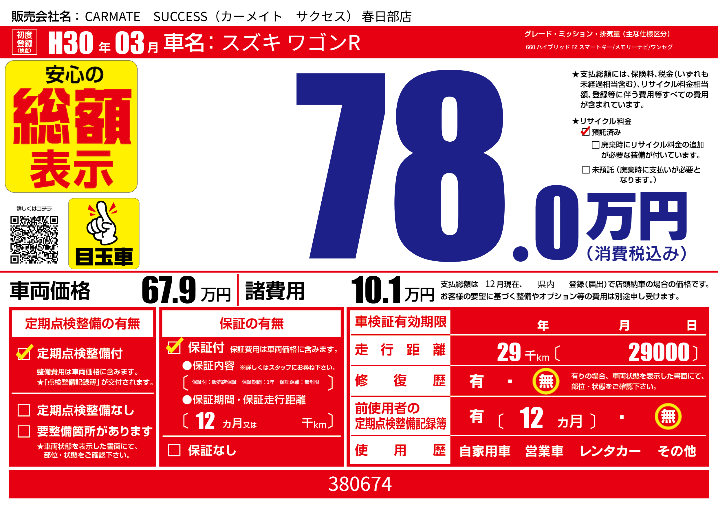 | 走行キロ | 2.9万km | 初年度登録 | H30年03月 |