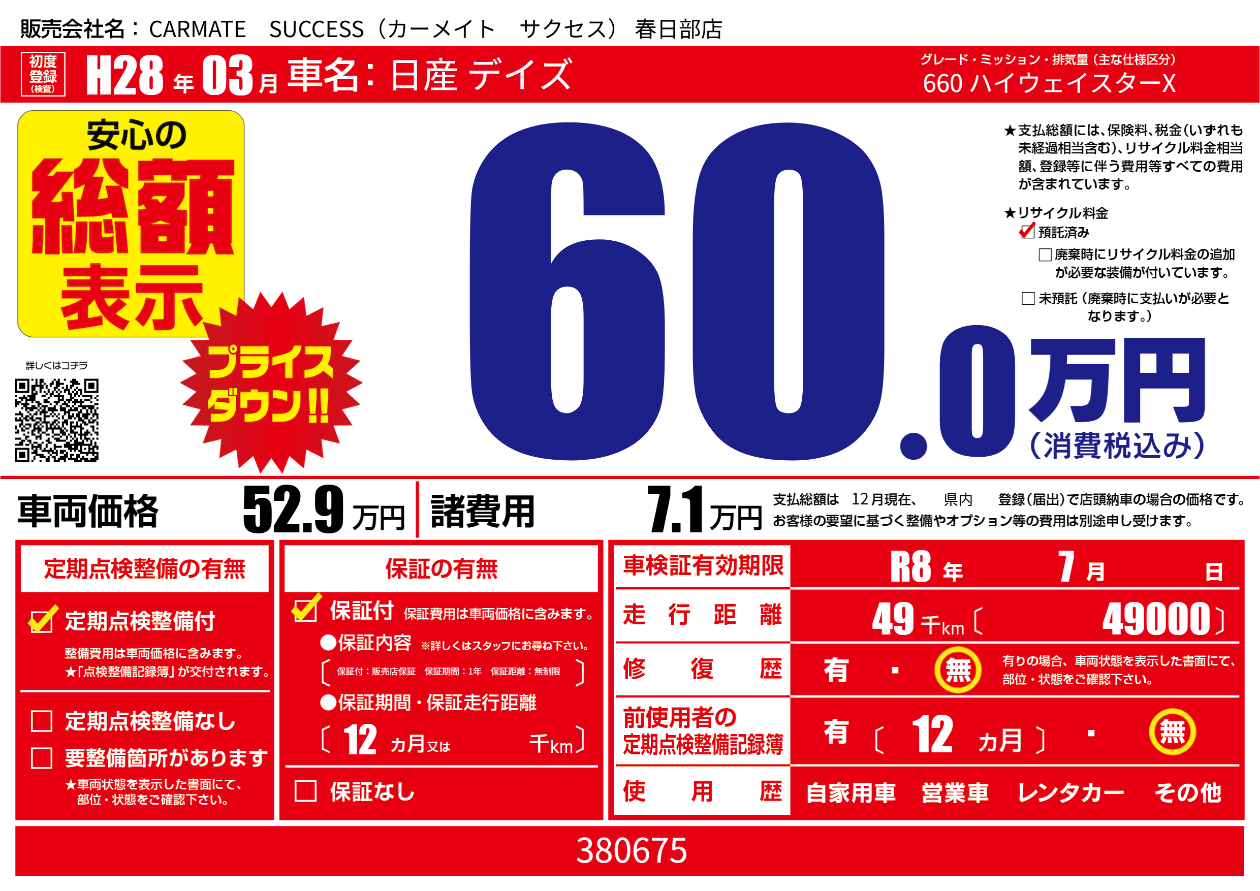 | 車名 | 日産 デイズ | グレード ミッション 排気量 |