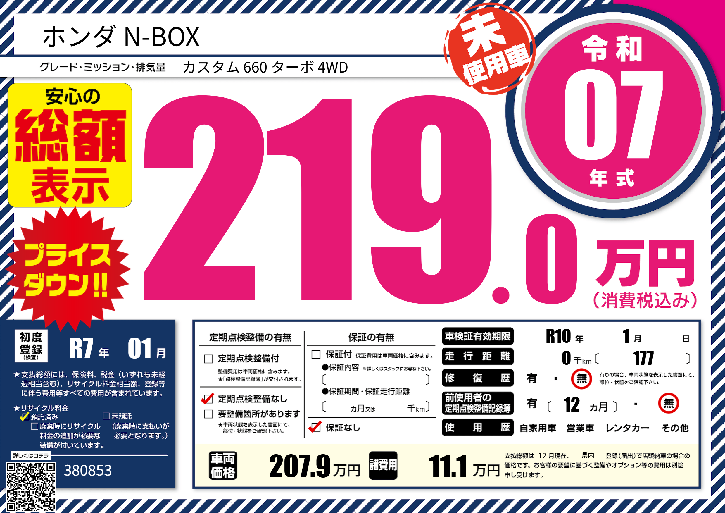 | 走行キロ | - | 初年度登録 | R7年01月 |