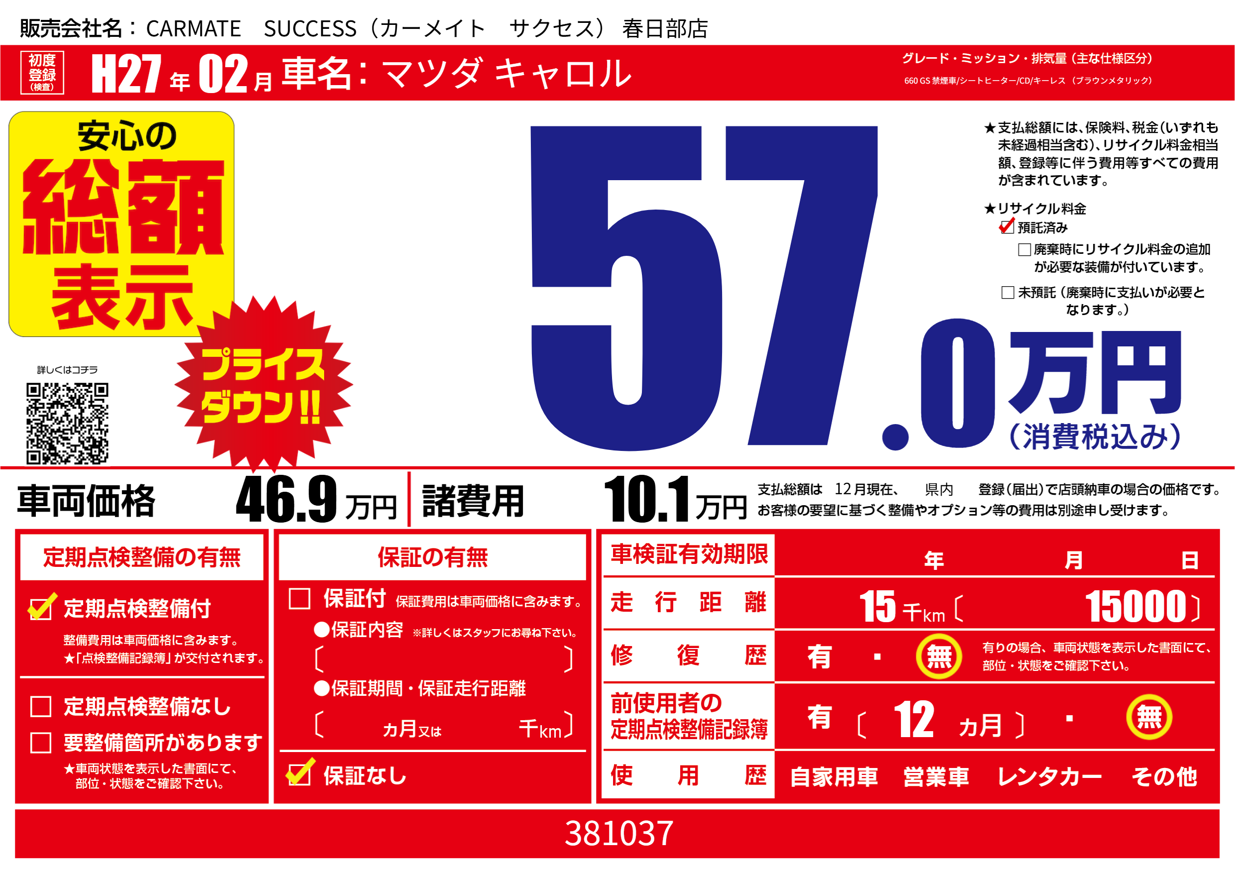 | 車名 | マツダ キャロル | グレード ミッション 排気量 |
