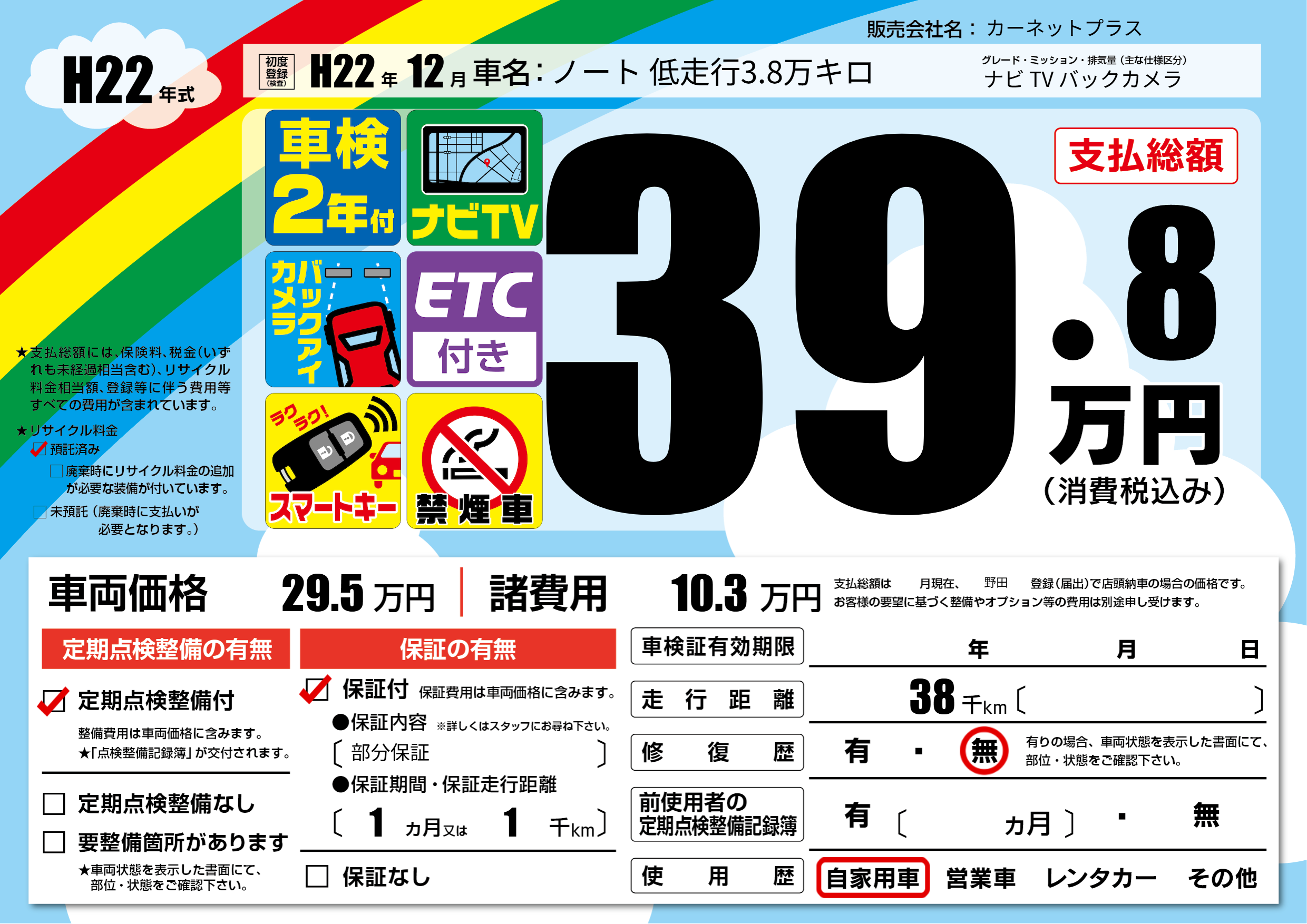 | 走行キロ | 3.8万km | 初年度登録 | H22年12月 |