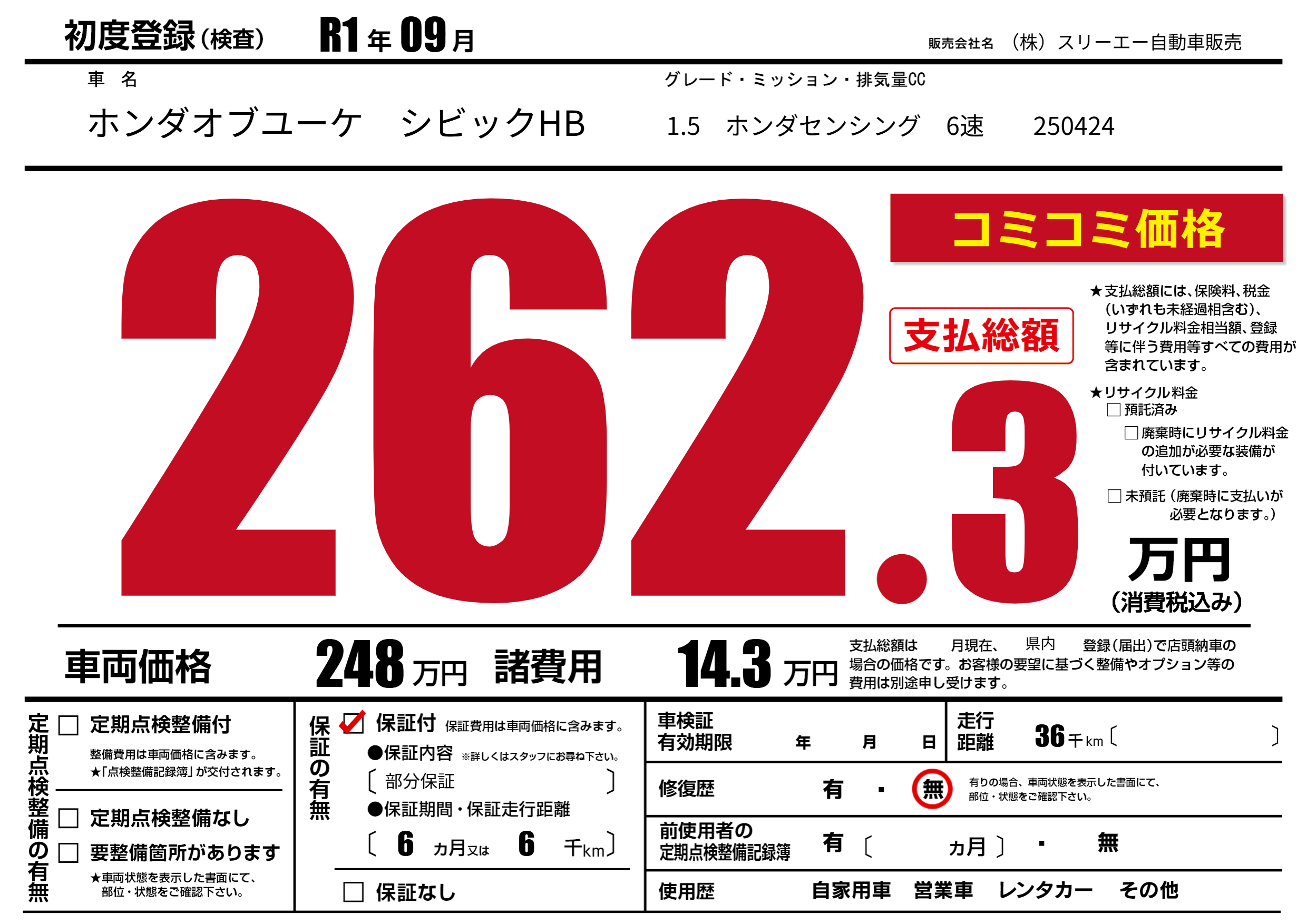保証付き 保証内容(部分保証) 6ヶ月または6千km |