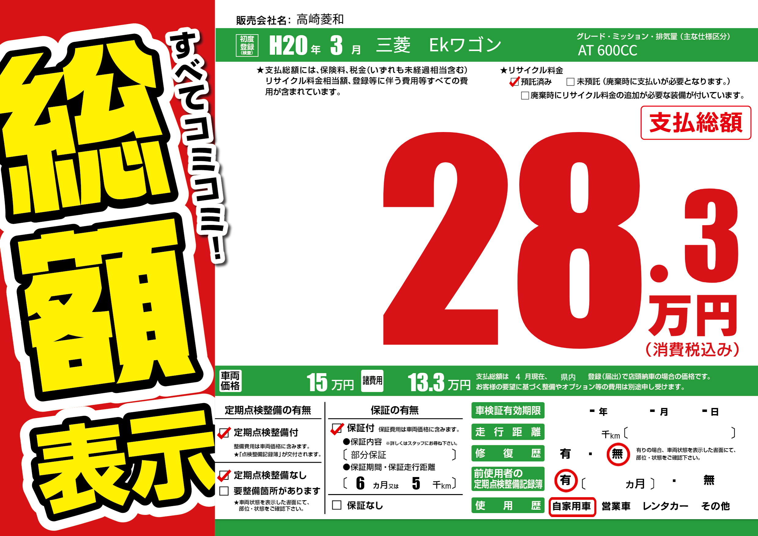 | 車名 | 三菱 Ekワゴン | グレード ミッション 排気量 |