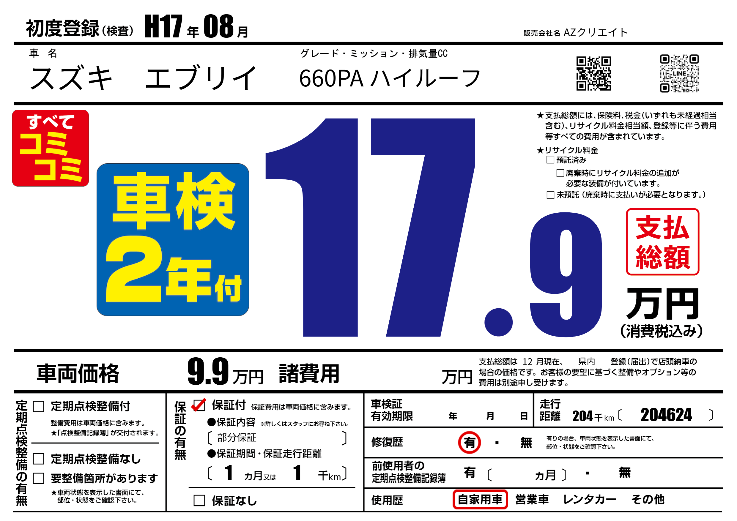 | 走行キロ | 20.4万km | 初年度登録 | H17年08月 |