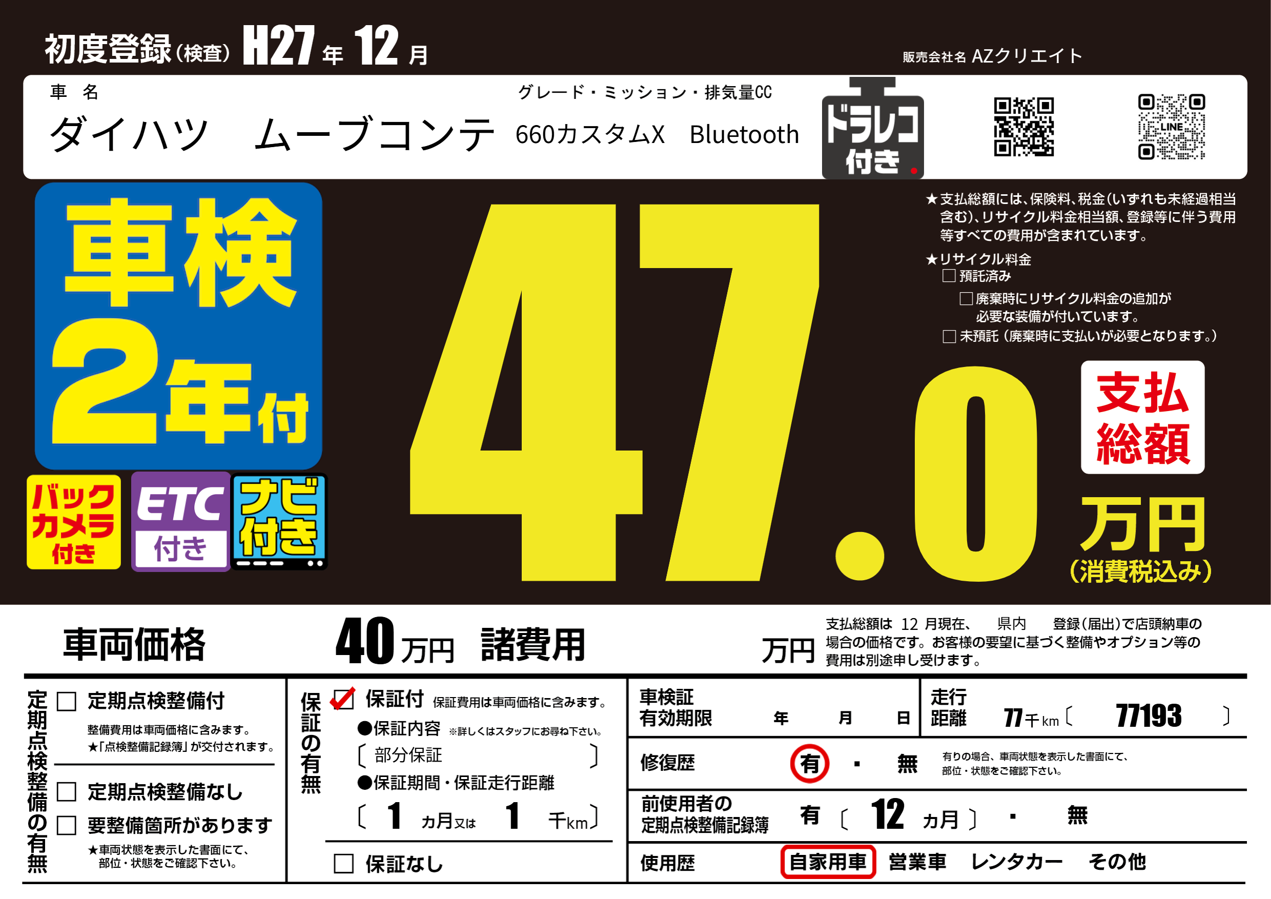 | 走行キロ | 7.7万km | 初年度登録 | H27年12月 |