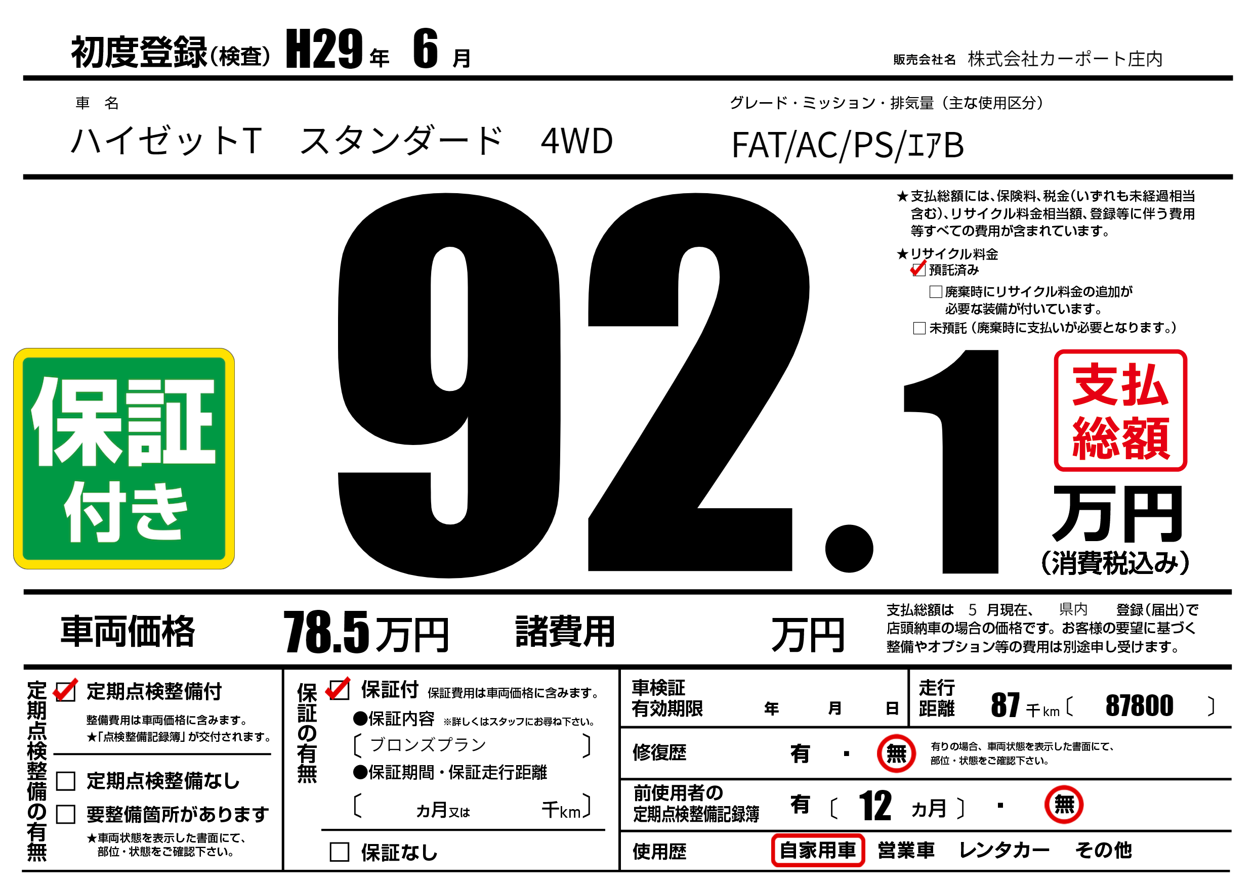 | 車名 | ハイゼットT スタンダード 4WD | グレード ミッション 排気量 |