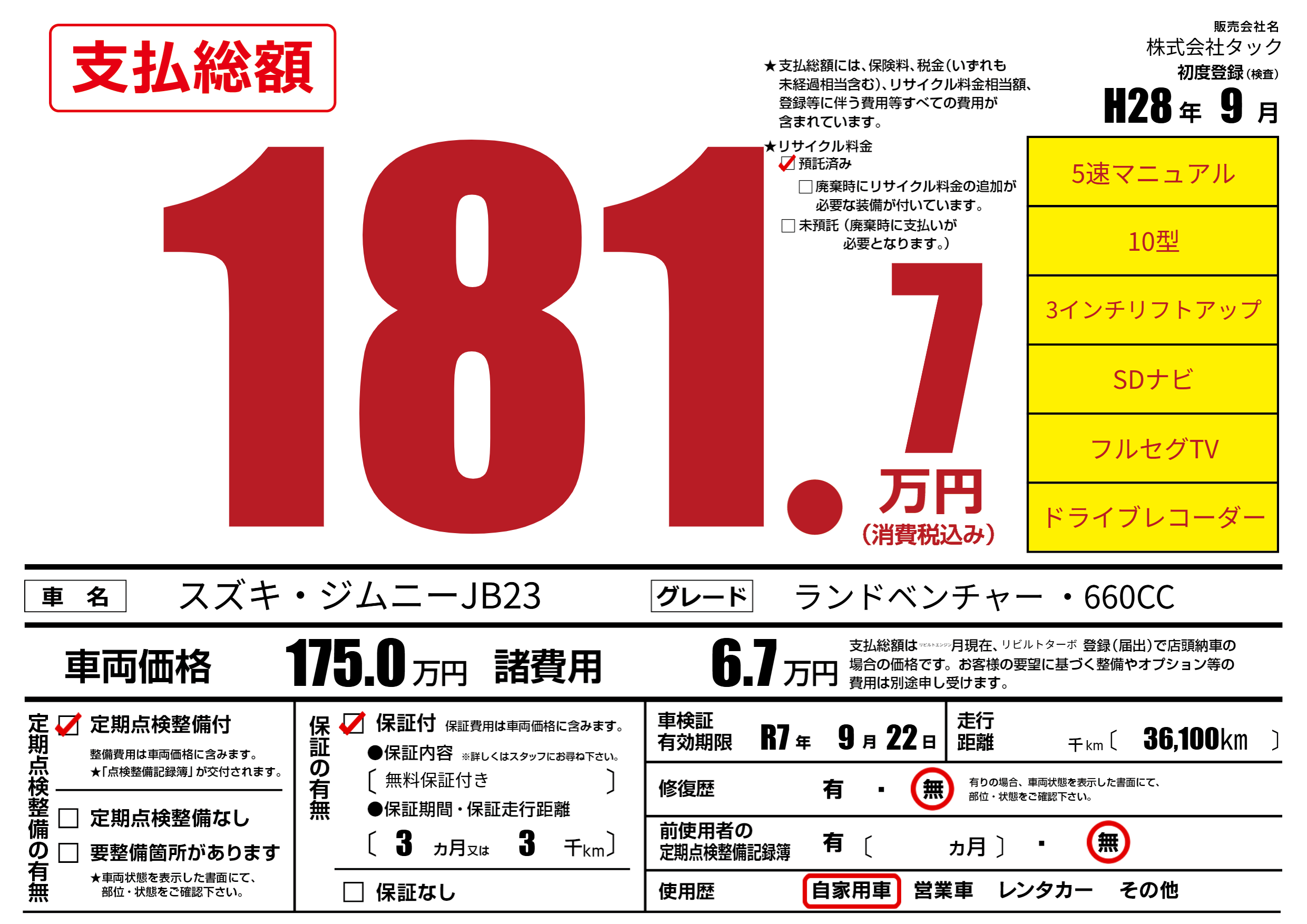なし | 車検制限 | R7年9月22月 |