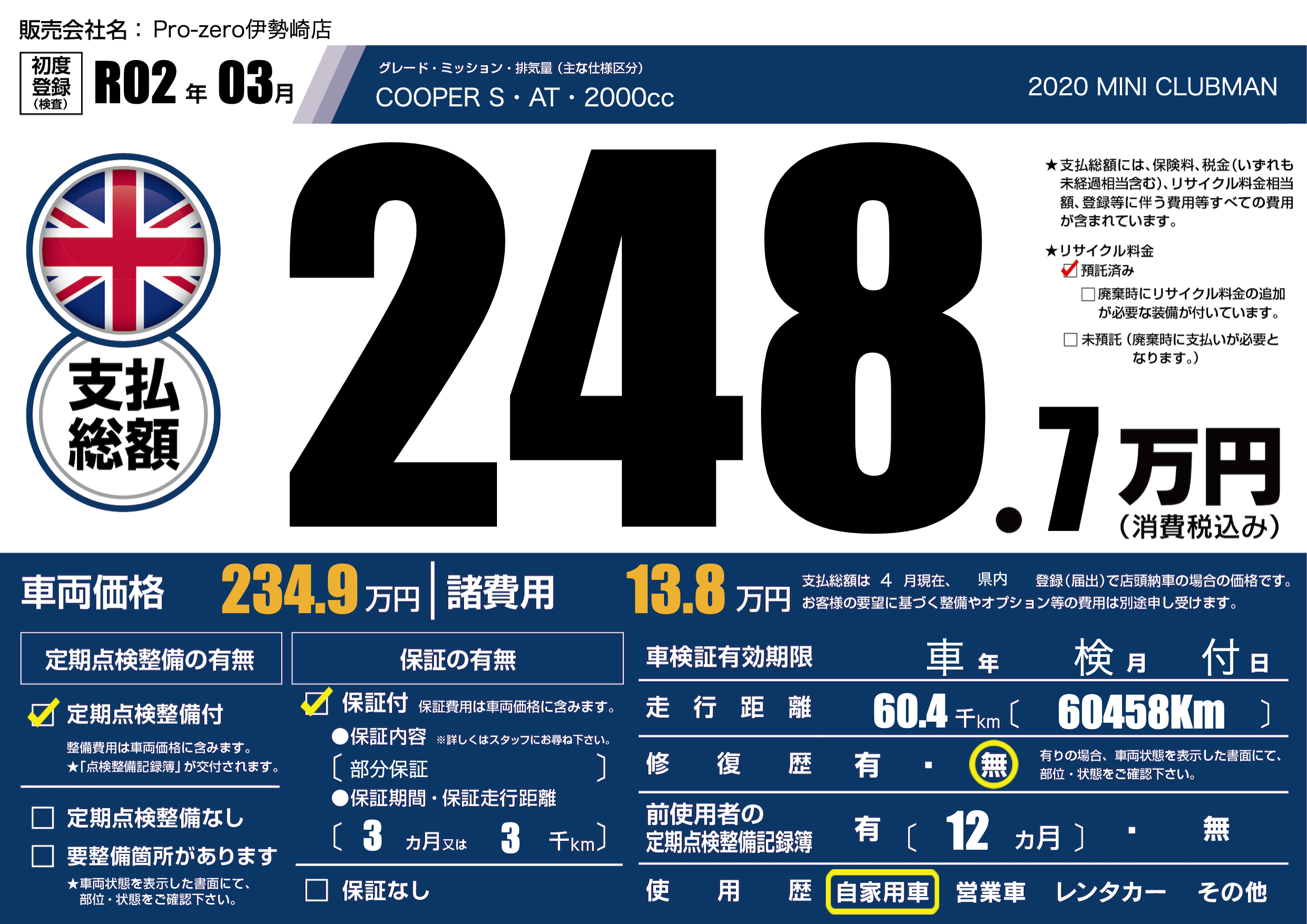 | 車名 | 2020 MINI CLUBMAN | グレード ミッション 排気量 |