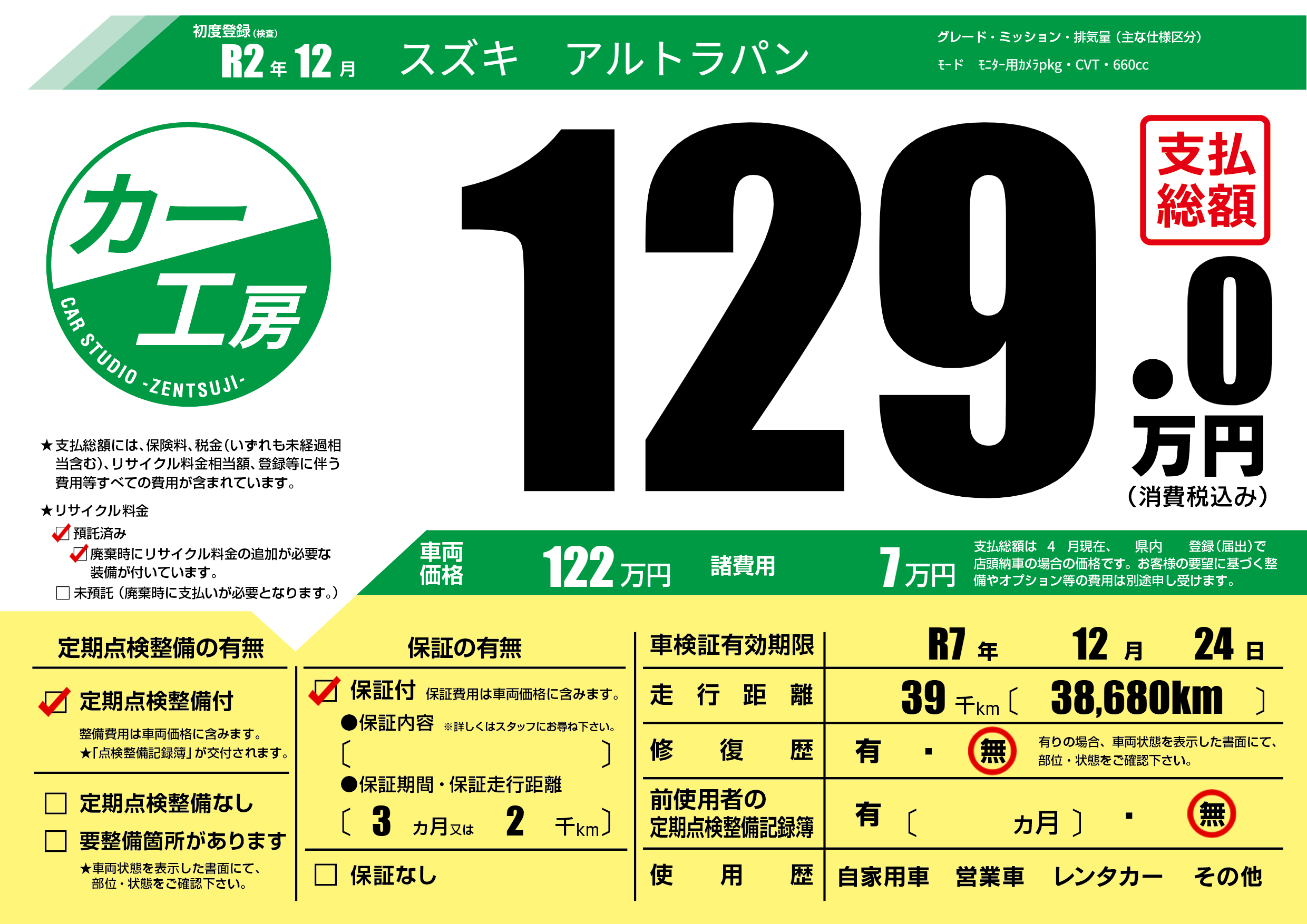 | 走行キロ | 3.9万km | 初年度登録 | R2年12月 |