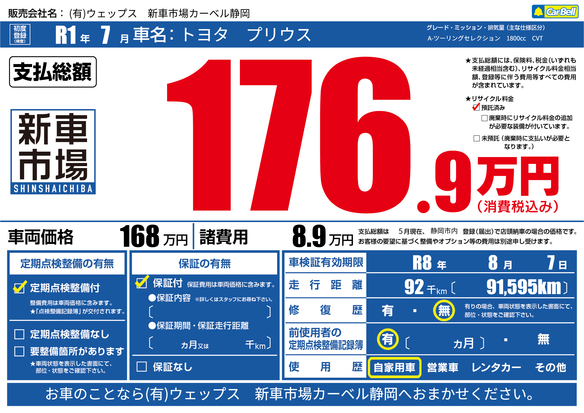 | 車名 | トヨタ プリウス | グレード ミッション 排気量 |