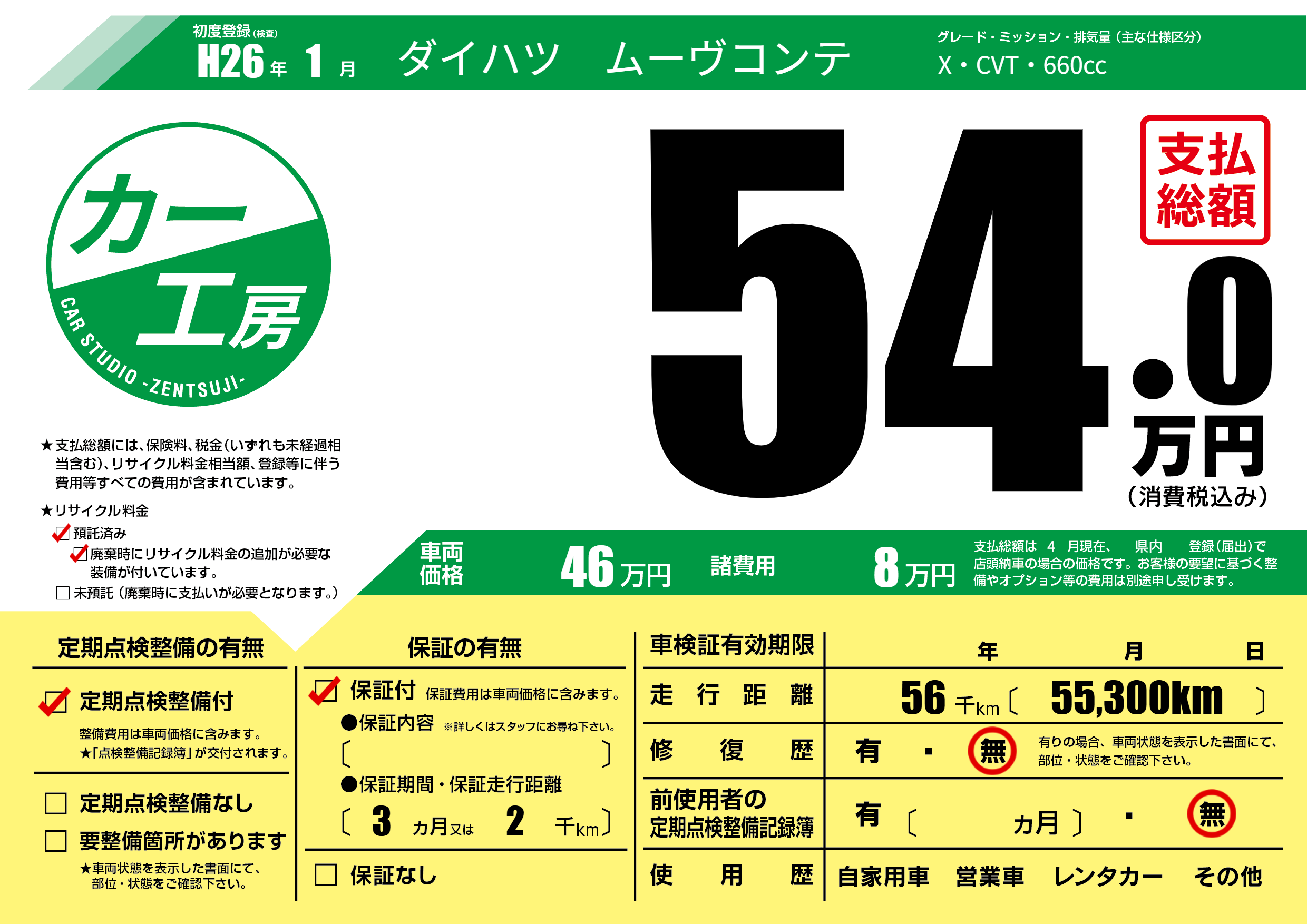 | 車名 | ダイハツ ムーヴコンテ | グレード ミッション 排気量 |