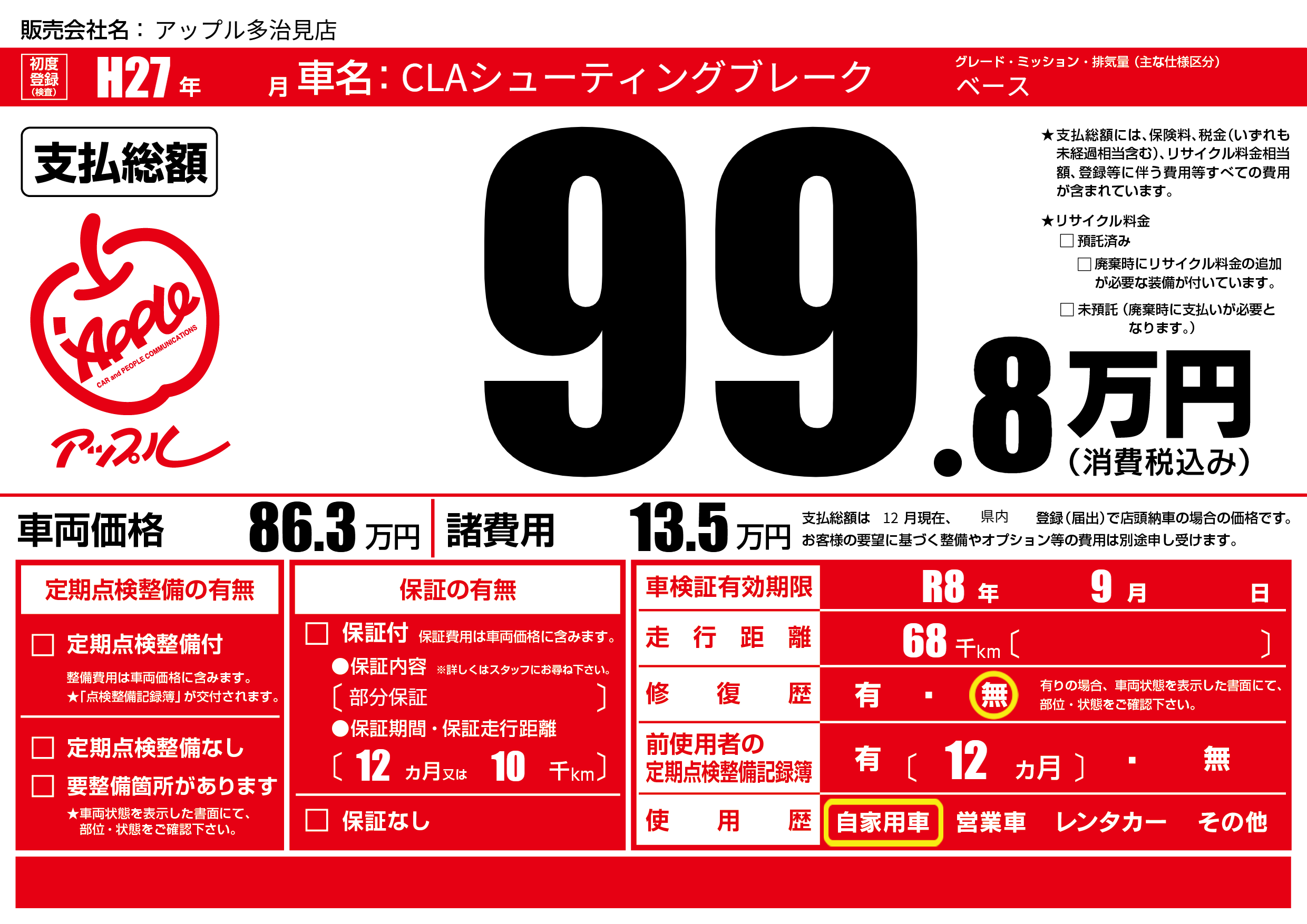 | 車名 | CLAシューティングブレーク | グレード ミッション 排気量 |