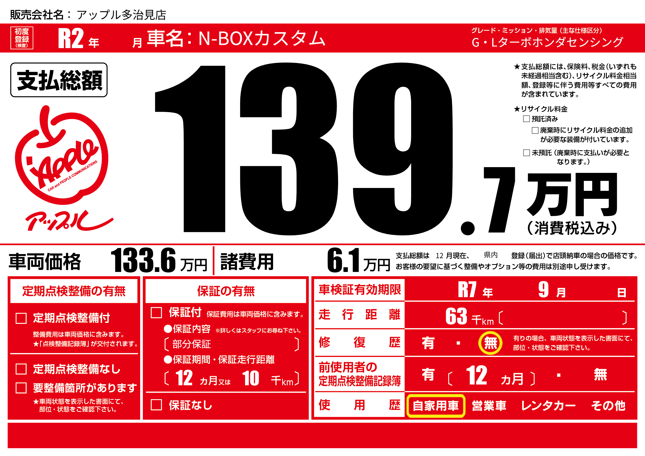 | 車名 | N-BOXカスタム | グレード ミッション 排気量 |