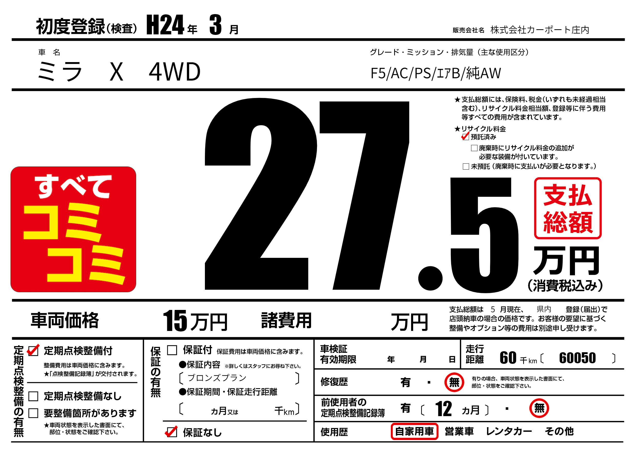 | 車名 | ミラ X 4WD | グレード ミッション 排気量 |