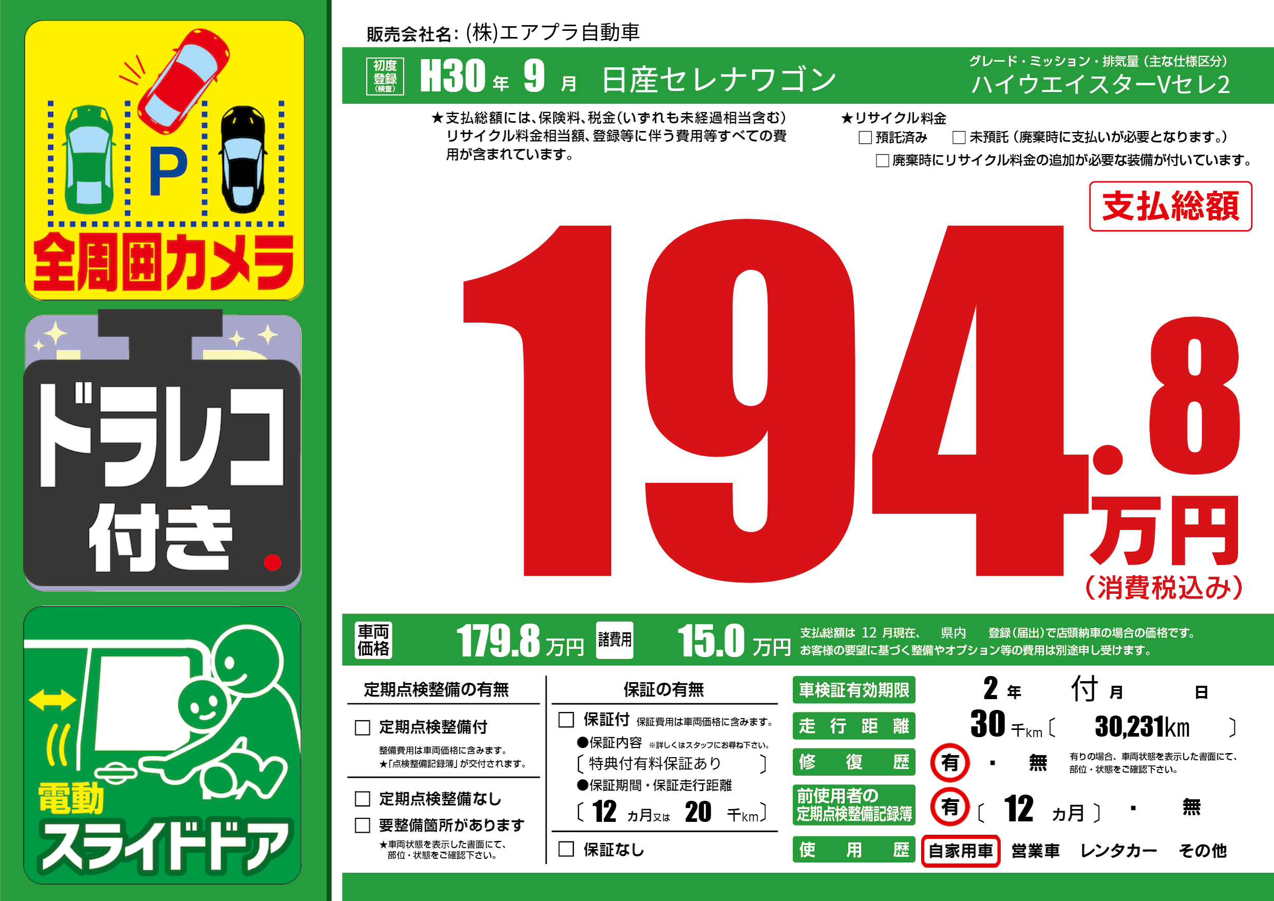 | 走行キロ | 3万km | 初年度登録 | H30年9月 |