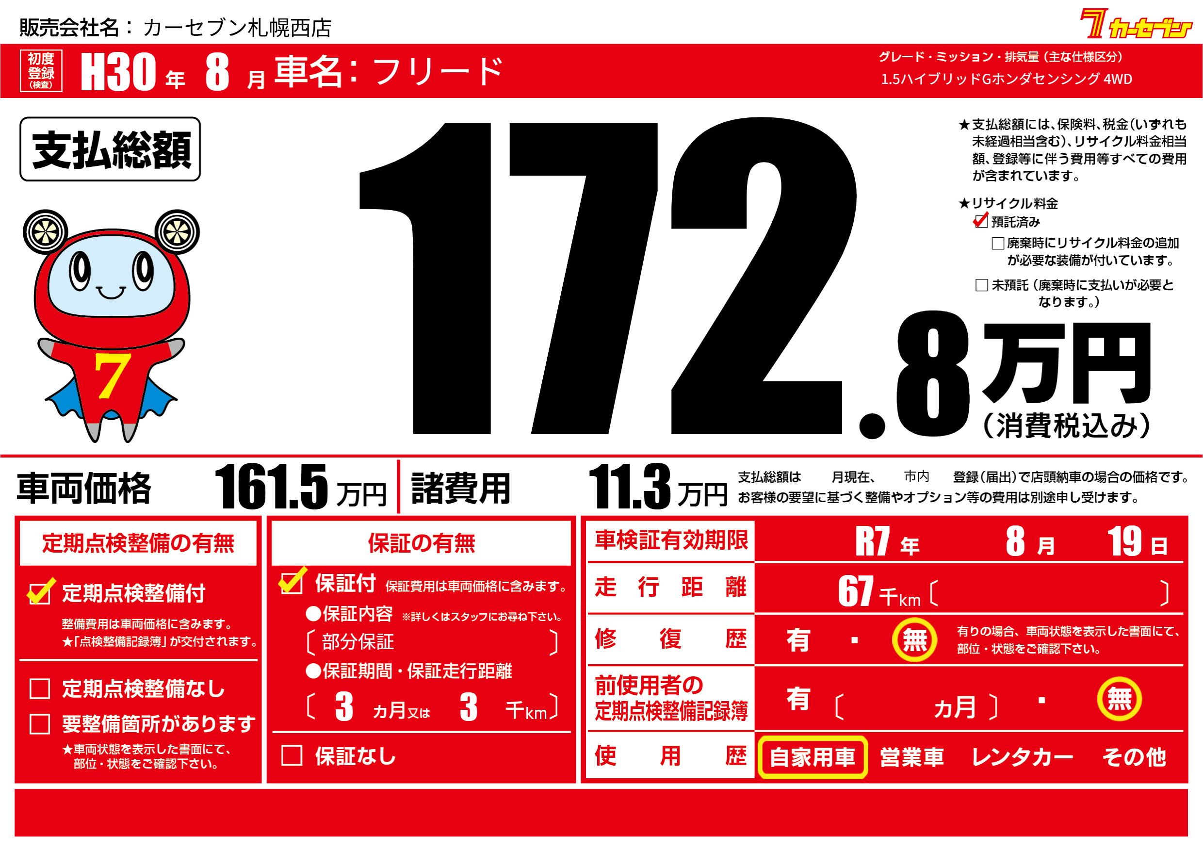 | 走行キロ | 6.7万km | 初年度登録 | H30年8月 |
