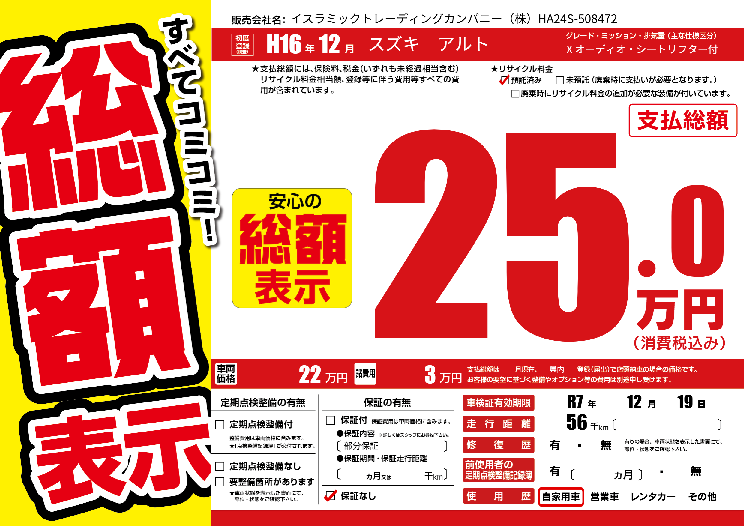 | 車名 | スズキ アルト | グレード ミッション 排気量 |