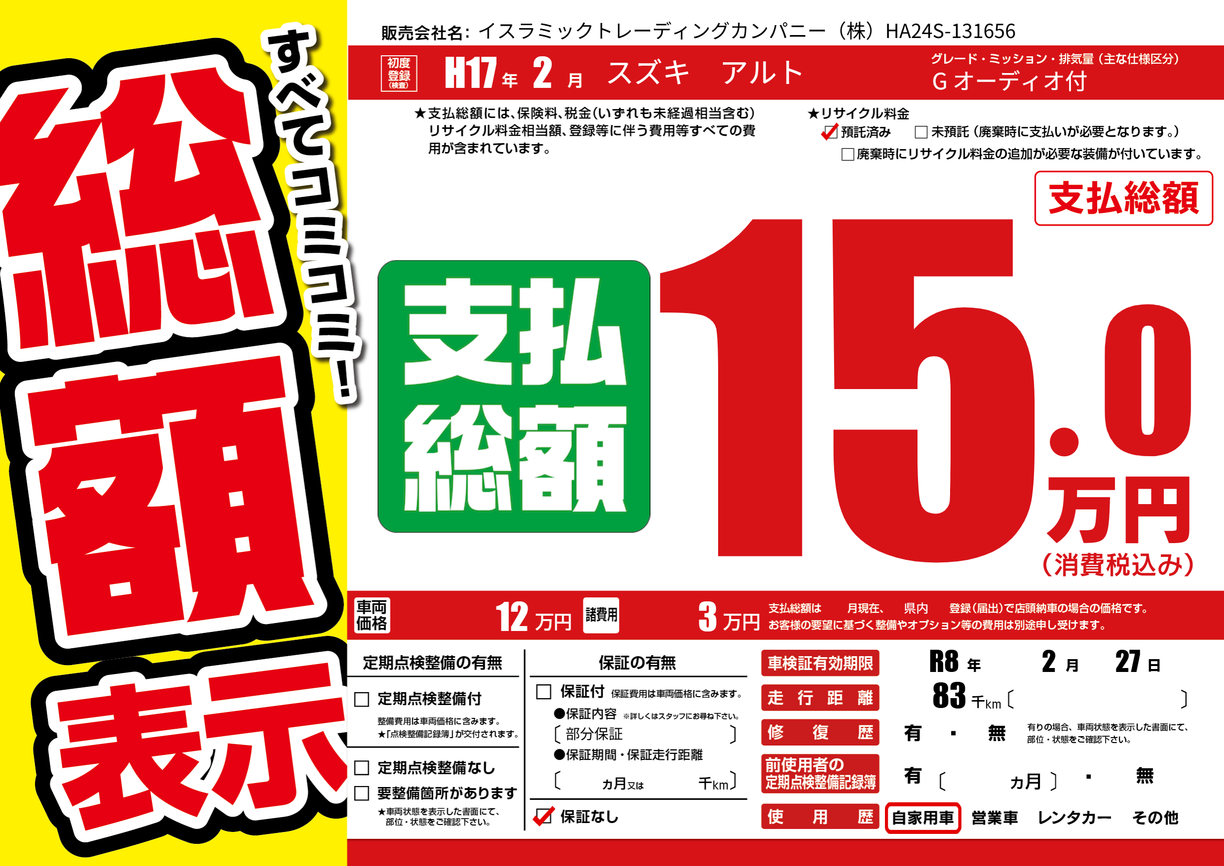 | 車名 | スズキ アルト | グレード ミッション 排気量 |