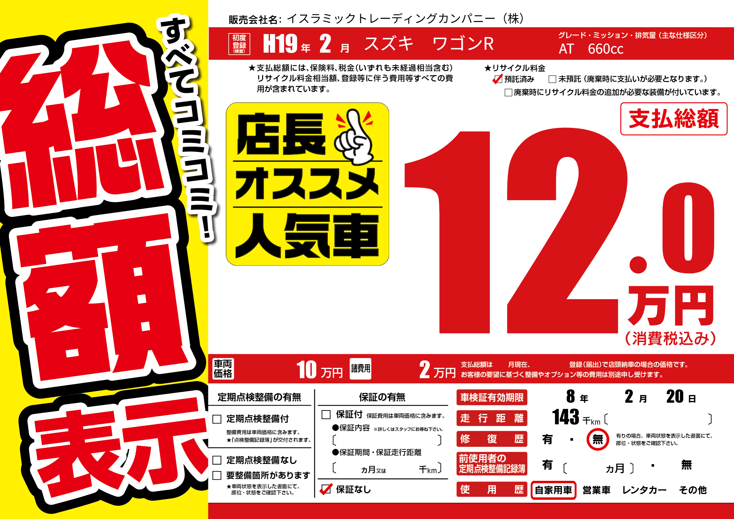| 車名 | スズキ ワゴンR | グレード ミッション 排気量 |