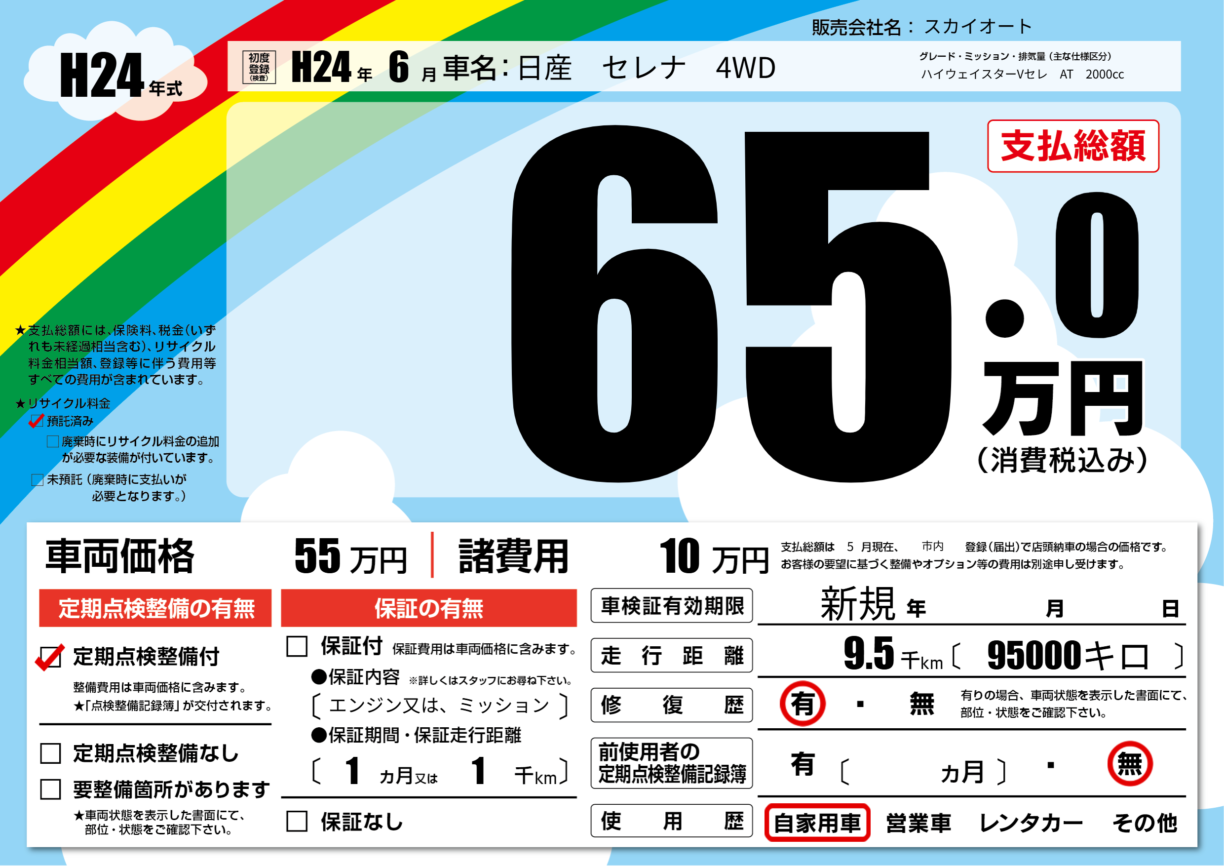 | 車名 | 日産 セレナ 4WD | グレード ミッション 排気量 |