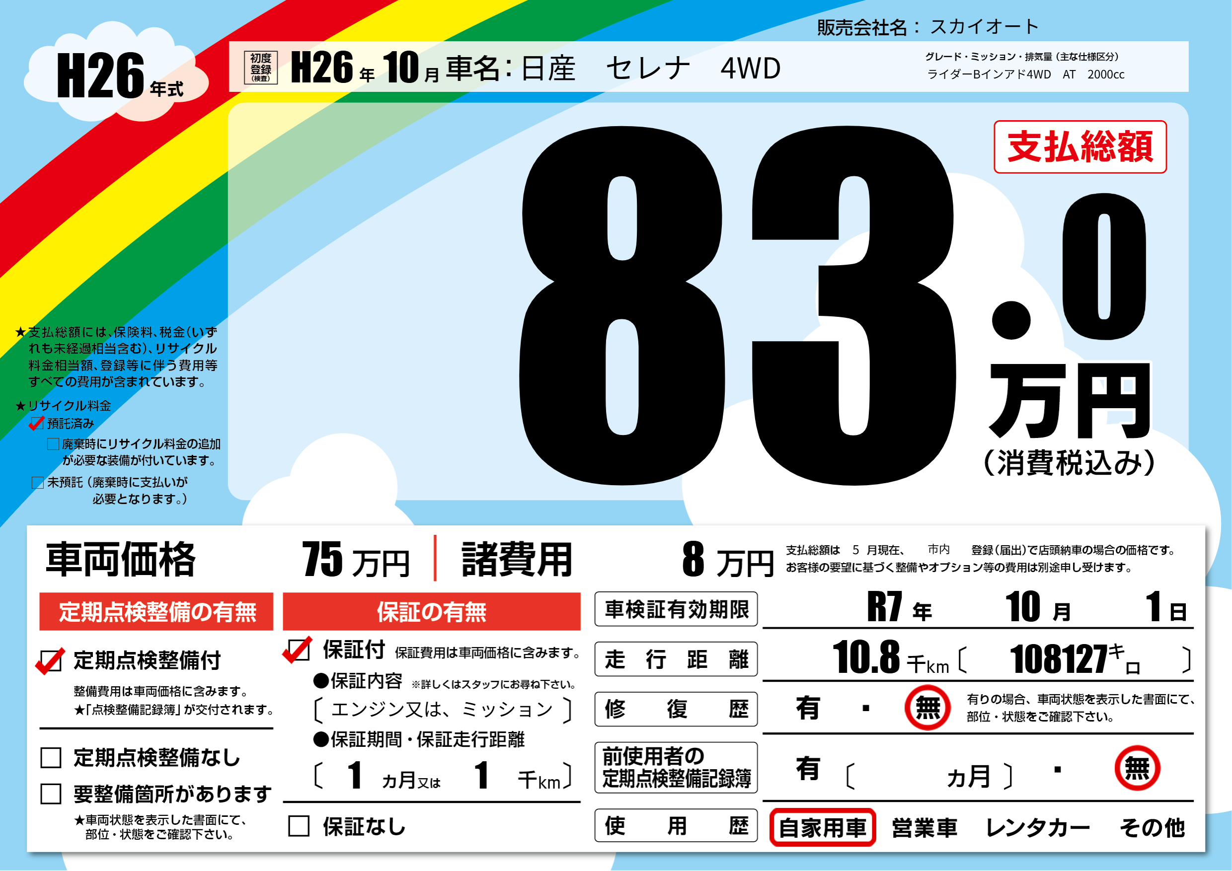 | 車名 | 日産 セレナ 4WD | グレード ミッション 排気量 |